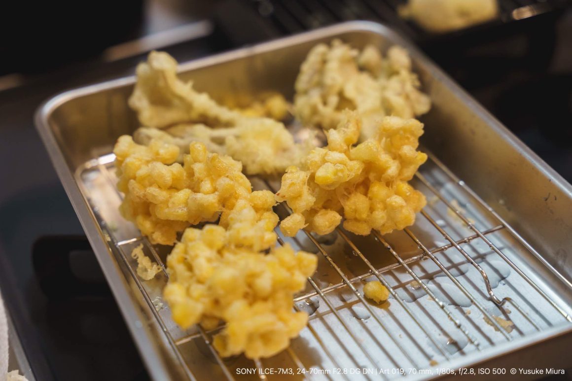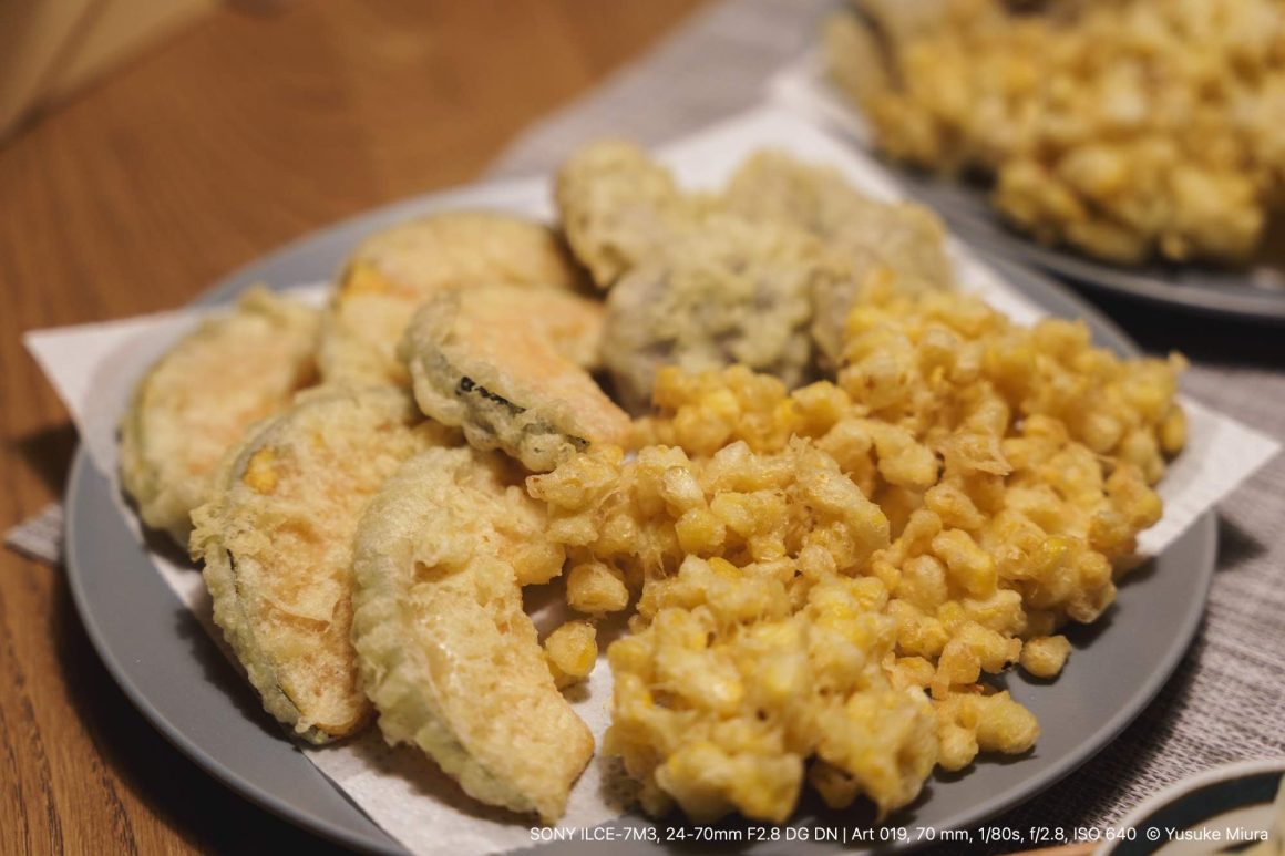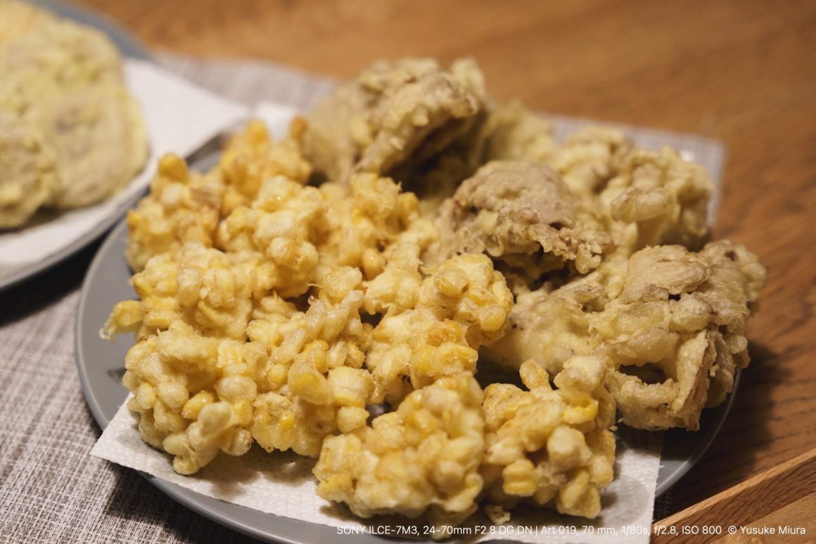 天ぷらはとうもろこしだけでなく、かぼちゃ、椎茸、そして舞茸も。長野できのこを調達しなかったのが後悔ポイントです。でもどれもサクサク&ジューシーでおいしかった。