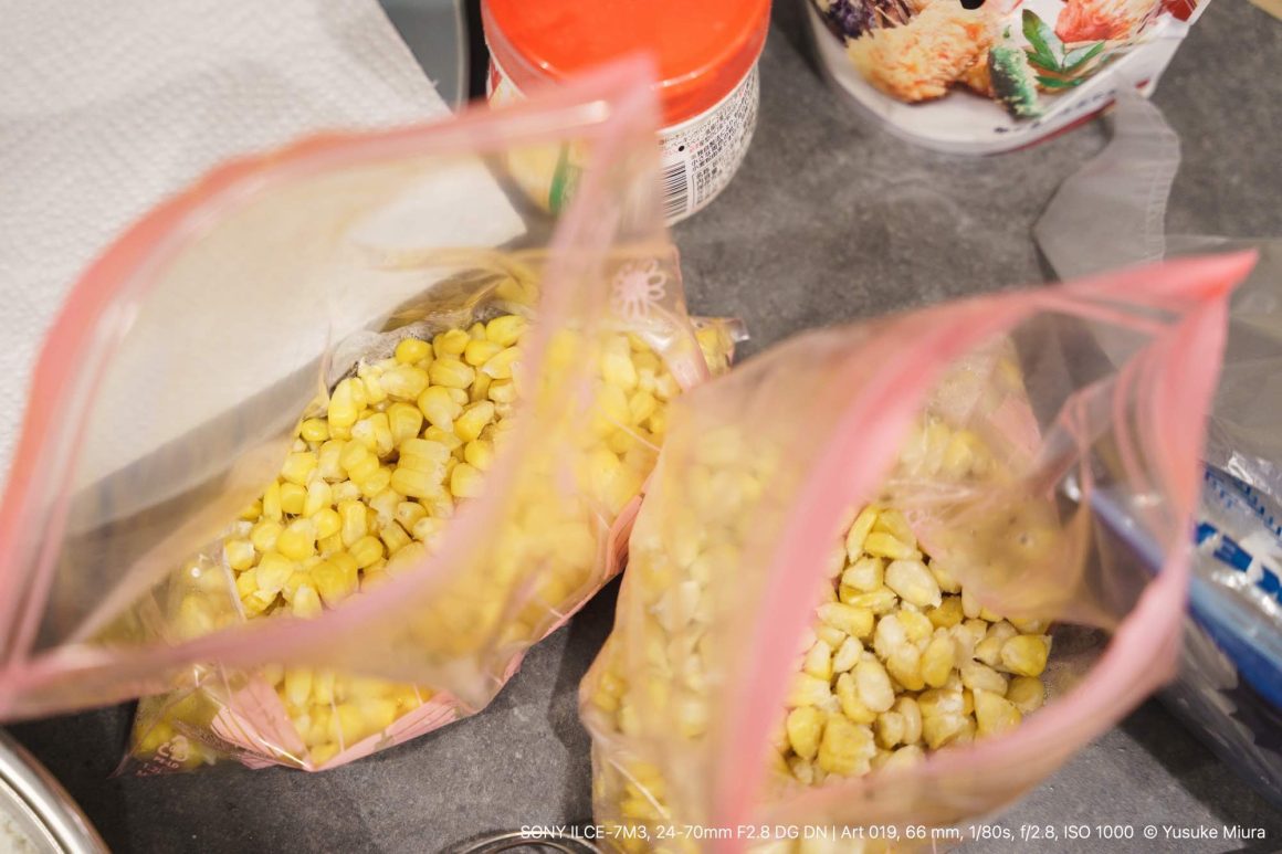 この本数となると、後半を指がもげそうになりました。楽して包丁で削ぎ落としてもいいんだけど、どうしても芯に残って無駄になる部分があるから、できるだけ手作業で芯から外していきました。せっかくのおいしいとうもろこしが勿体ないからね。