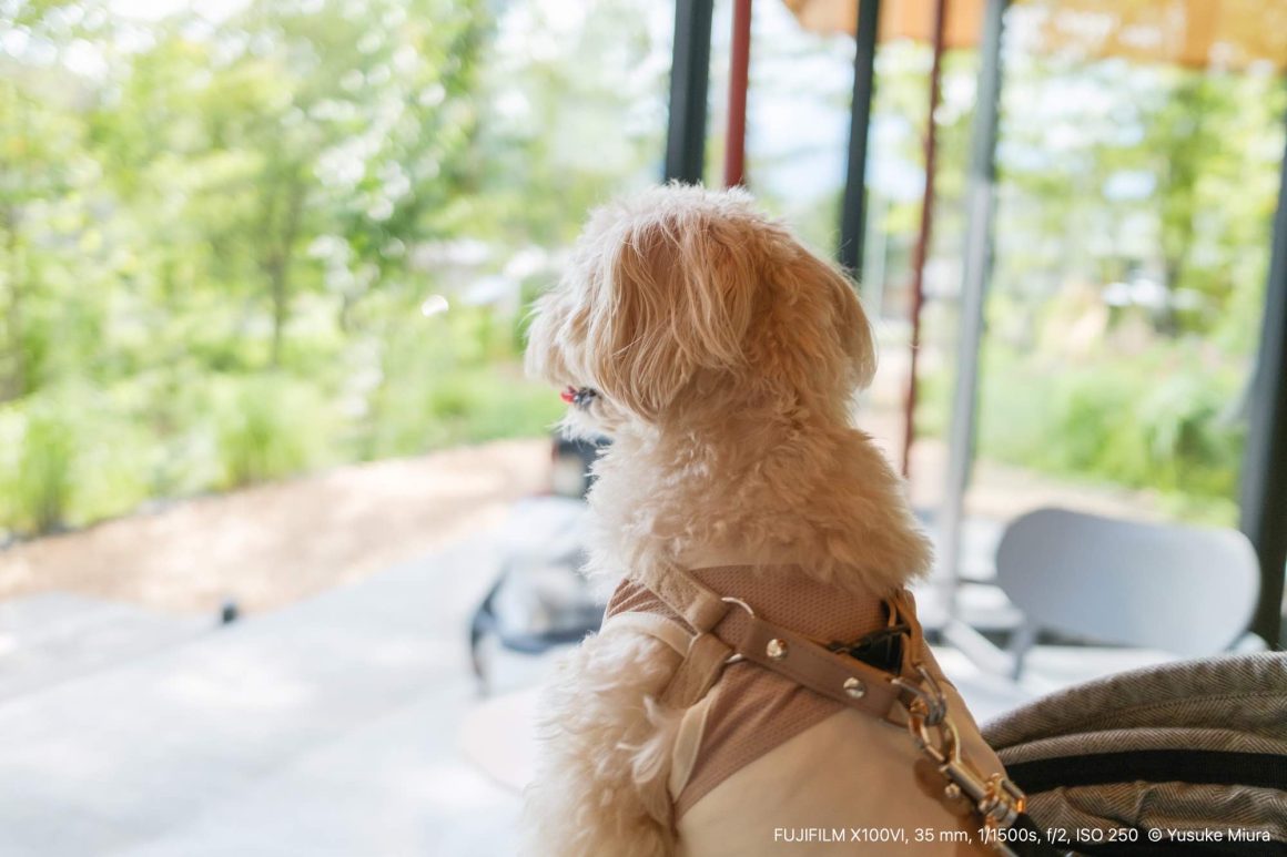 冷房の効いた室内で窓側にいるから、日差しでポカポカと気持ちいい席でした。だから犬もとても眠そう。僕らもだんだん眠くなってきました。軽井沢から横浜まで運転しないといけないから、もう少しのんびりします。