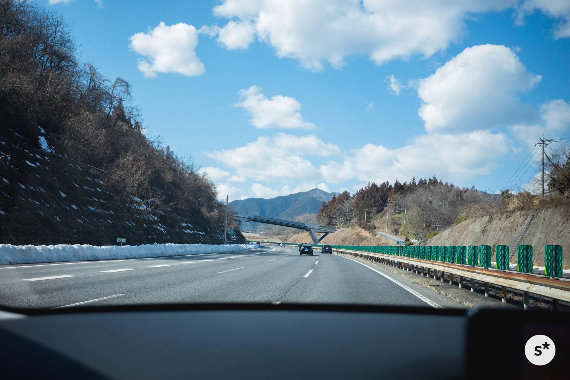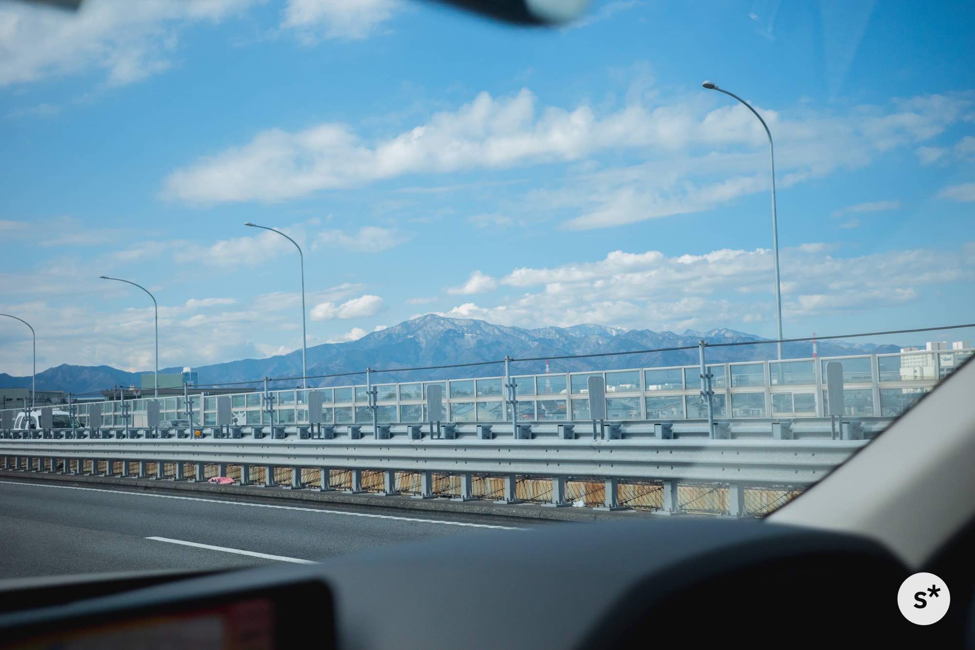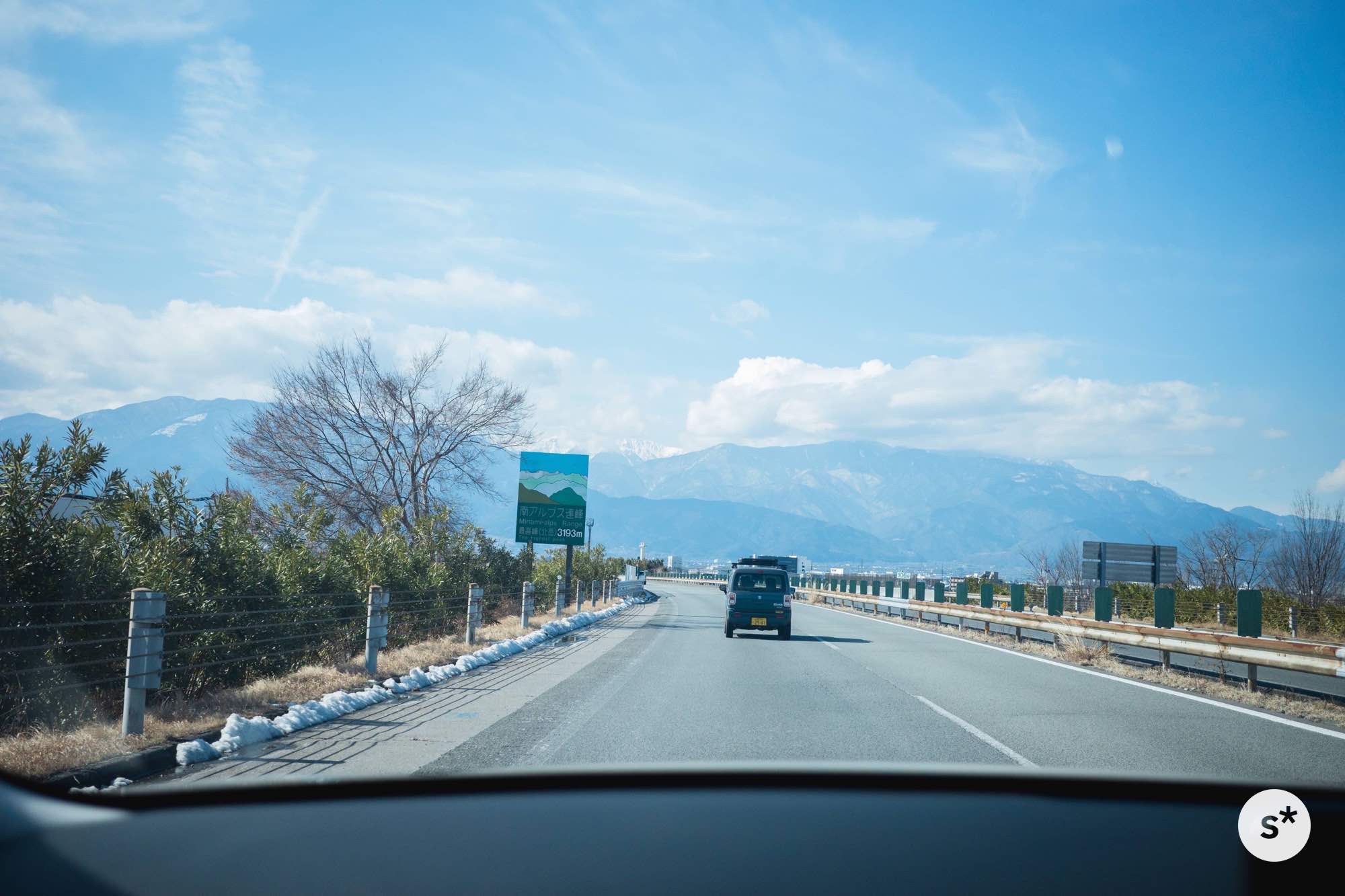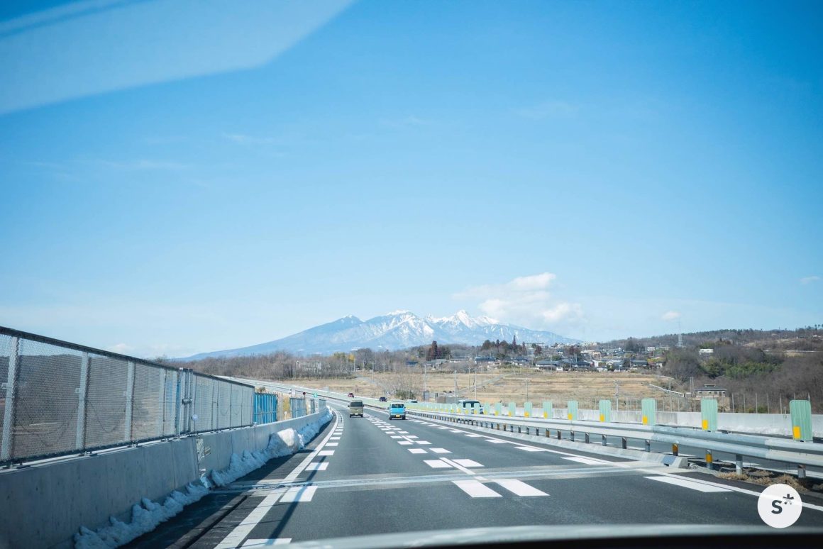 山梨県に入って笹子トンネルを越えると、雪化粧をした南アルプスの山々が見えてきました。それらを横目にぐんぐん進み、今度は八ヶ岳が目の前に。ここまで来ると目的地はそろそろです。