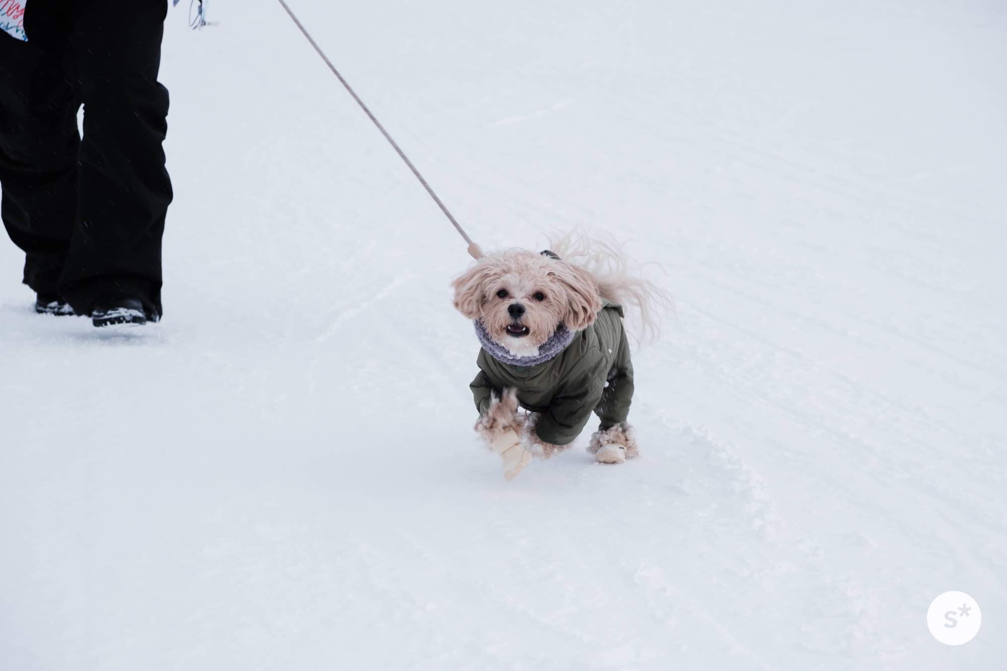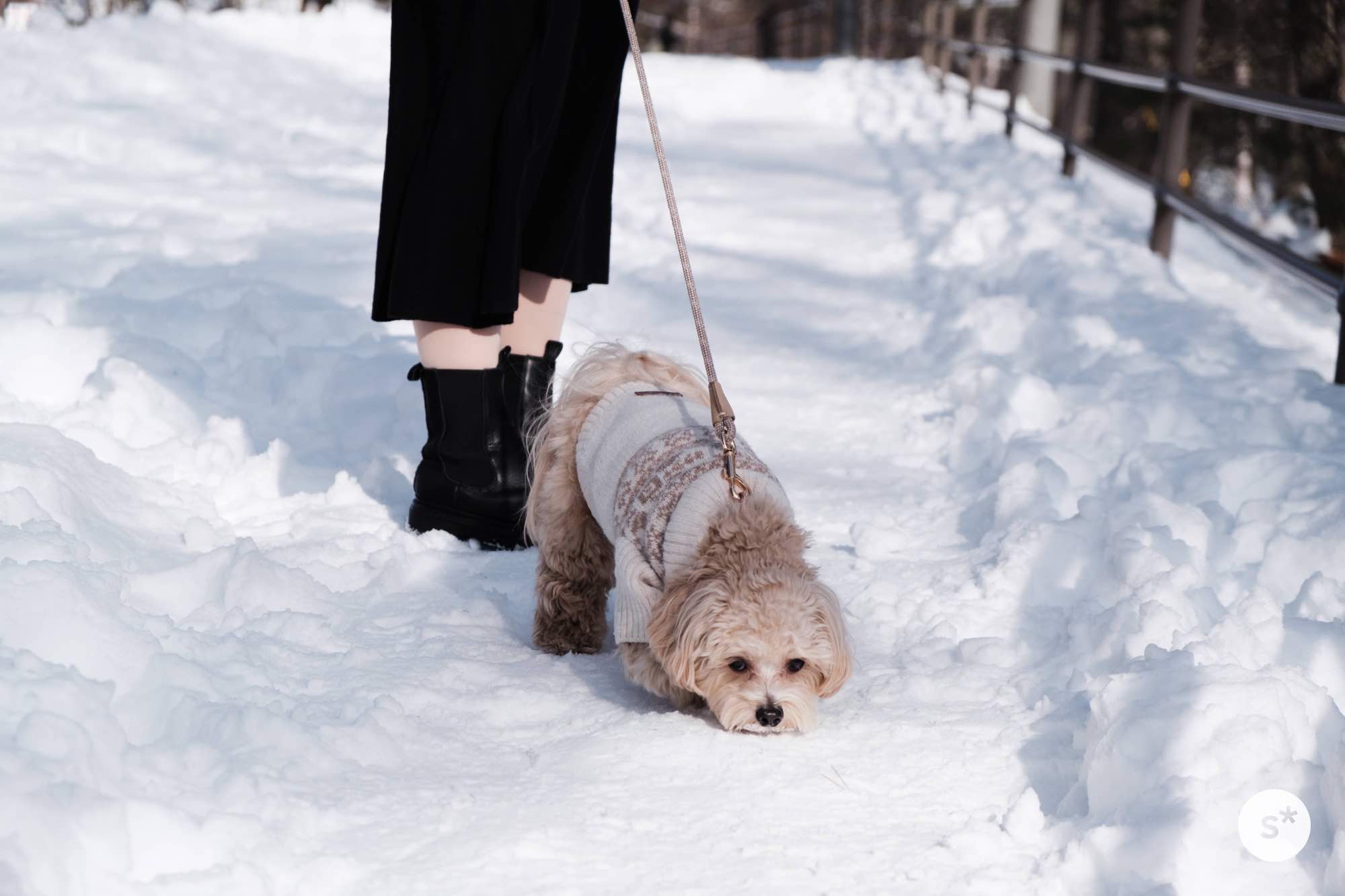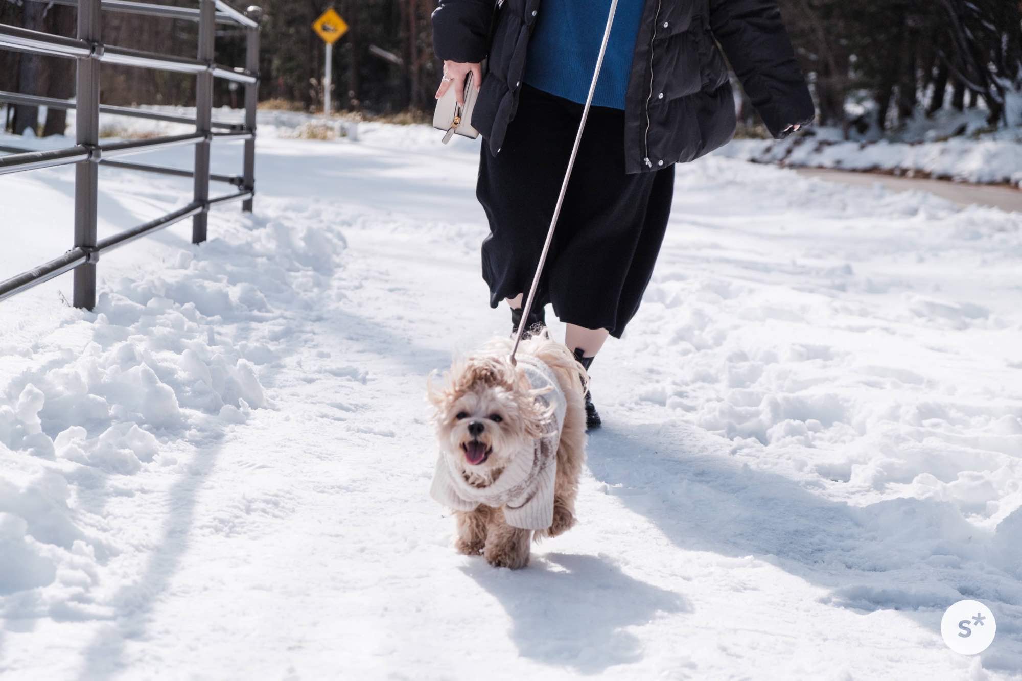 この日のために犬用のダウンジャケットやスニーカーも準備しました。0℃近い気温の中でも楽しく遊ぶためにはこれくらいの装備が必要なのです。