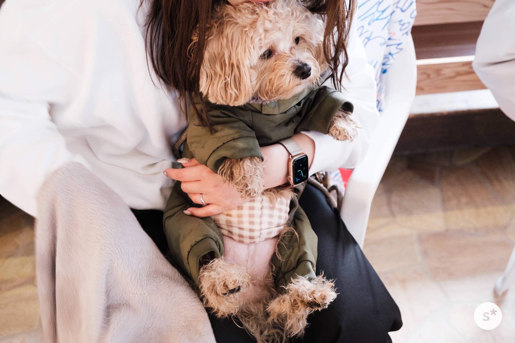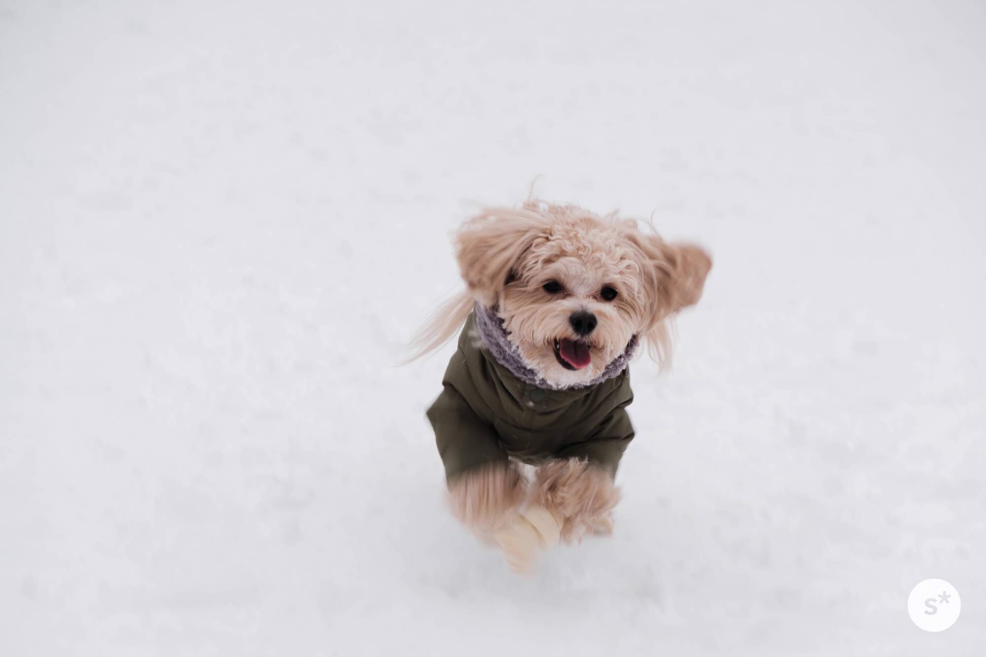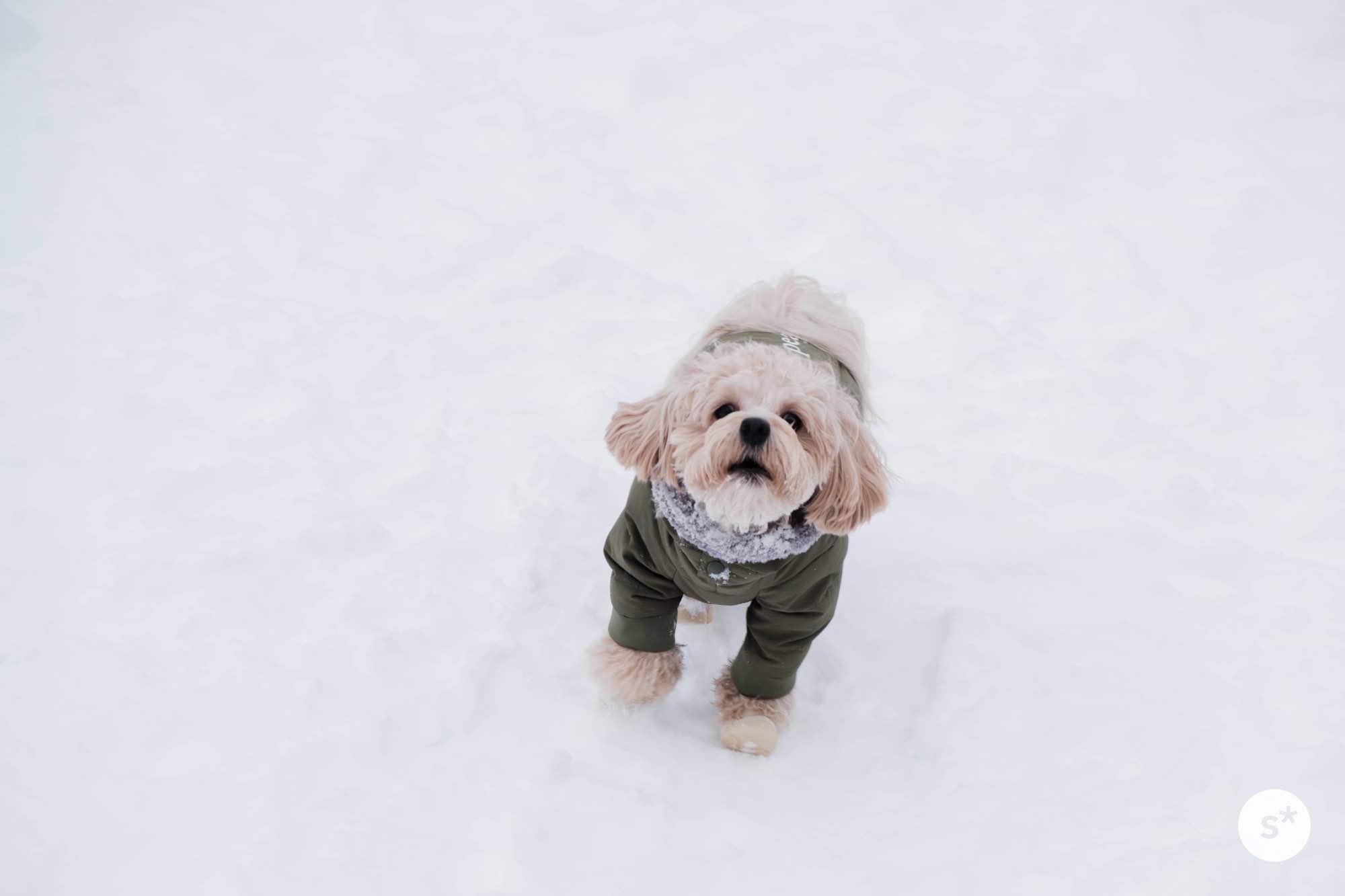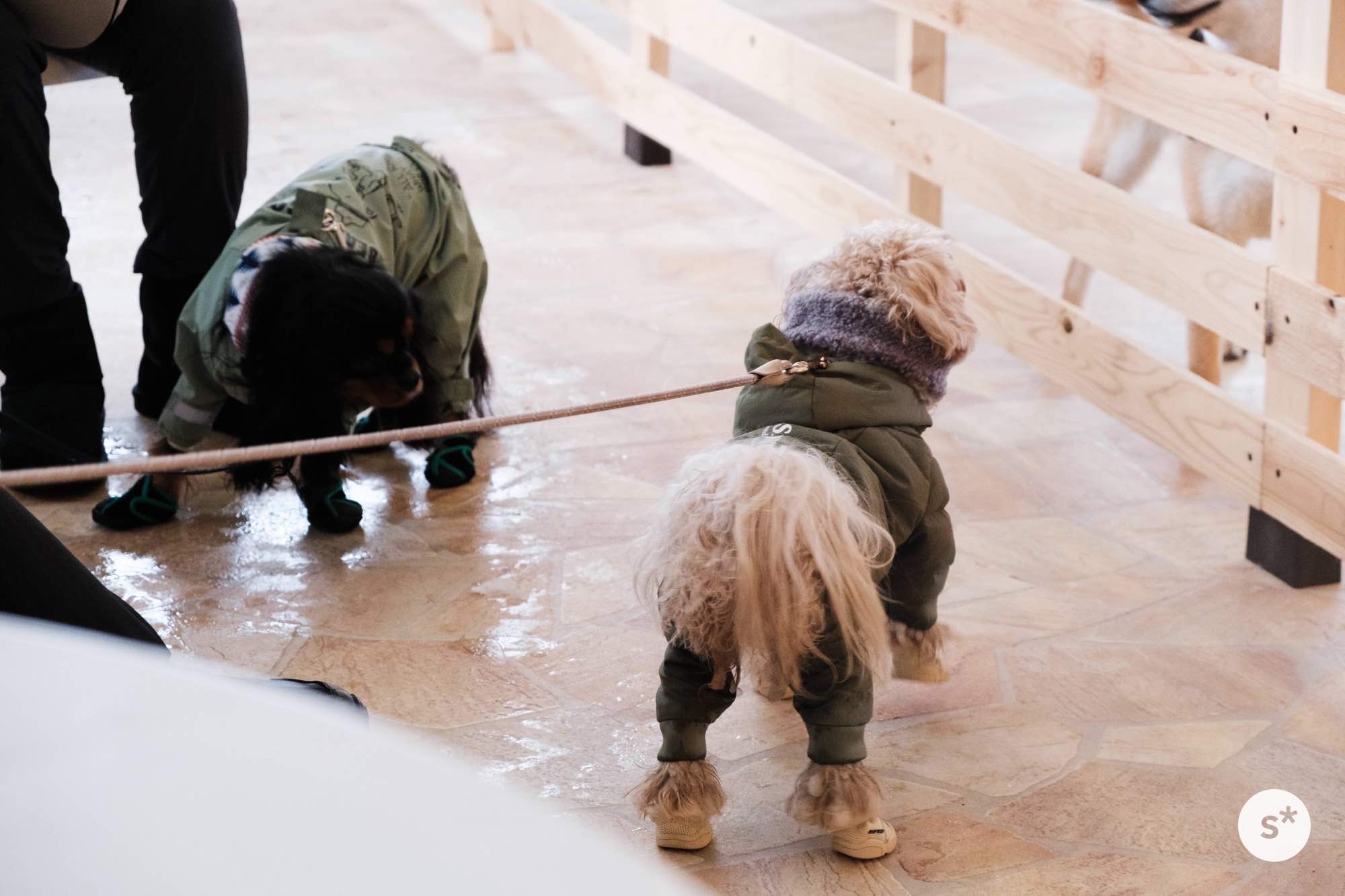 この日のために犬用のダウンジャケットやスニーカーも準備しました。0℃近い気温の中でも楽しく遊ぶためにはこれくらいの装備が必要なのです。