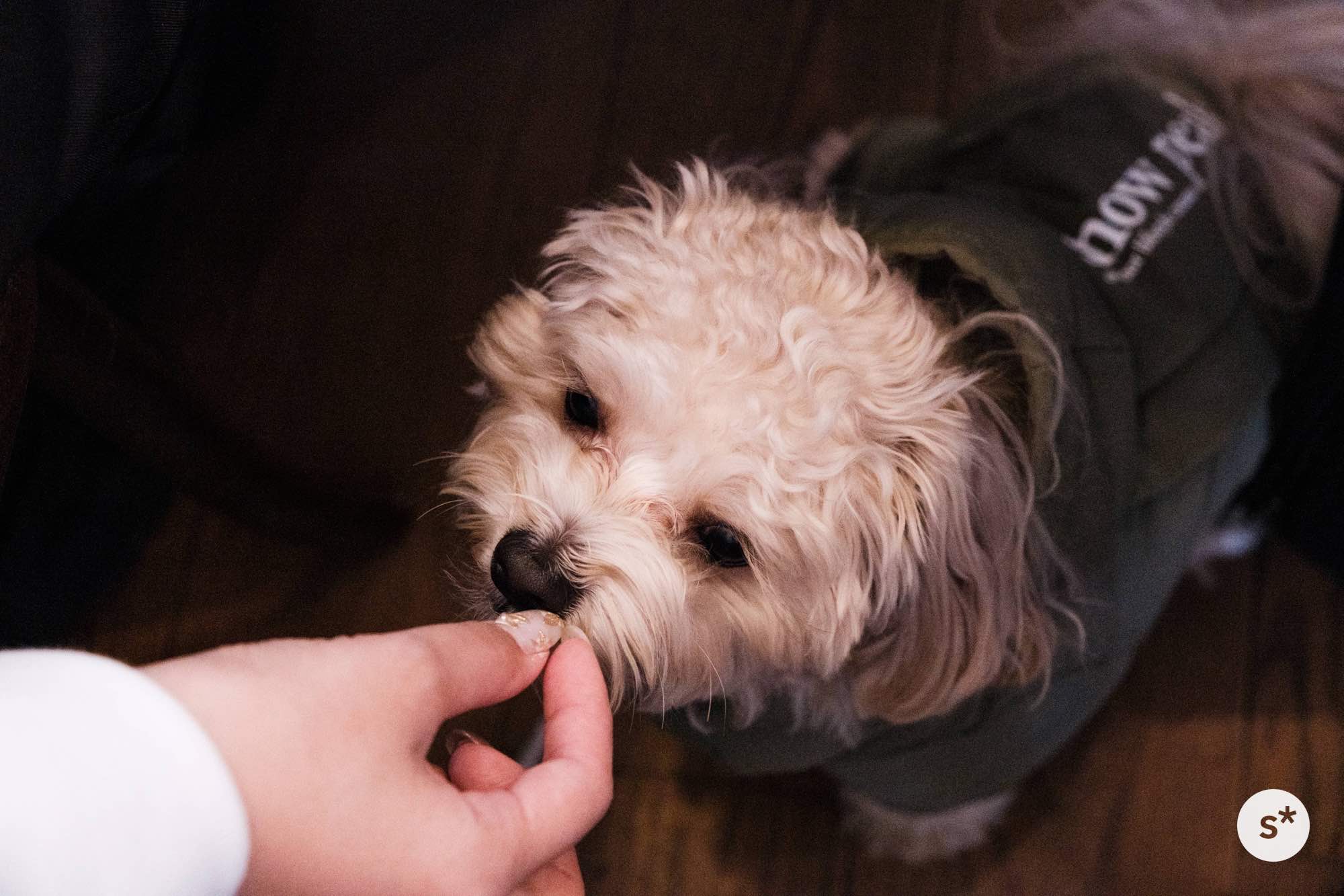 待っている間も慣れない場所でそわそわして落ち着かないので、おやつをあげて静かにしてもらいます。にんじんのマフィンが来てからはもう大興奮だよね。