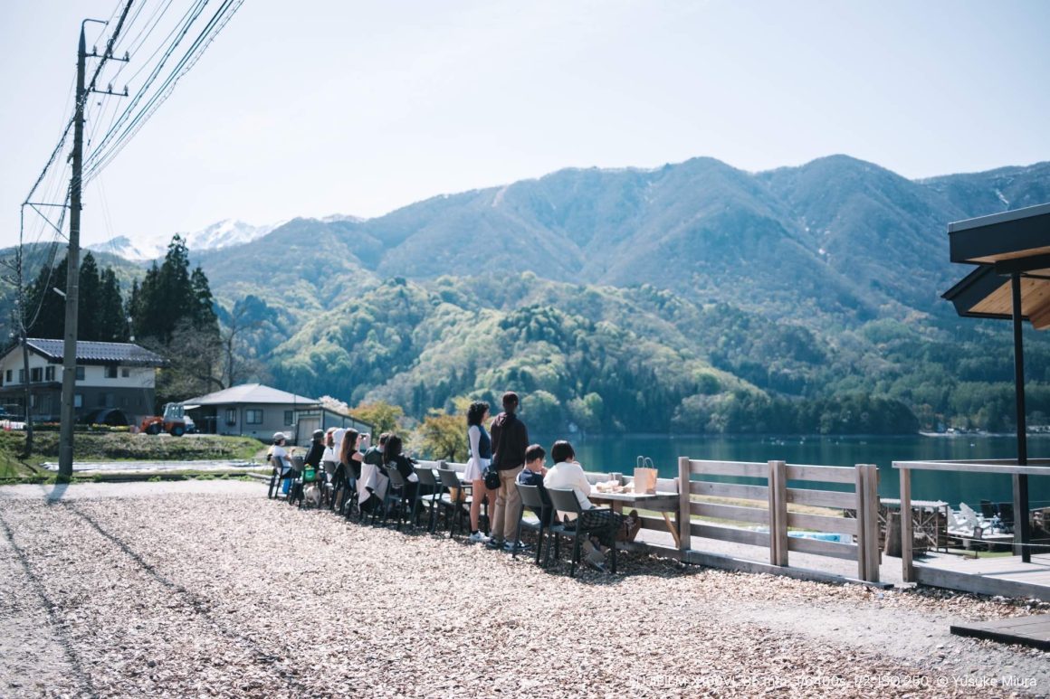 そしてテラス席へ。最前列の端っこという最高のロケーションに案内していただき、青々とした青木湖と雄大な北アルプスの山々を臨むことができました。