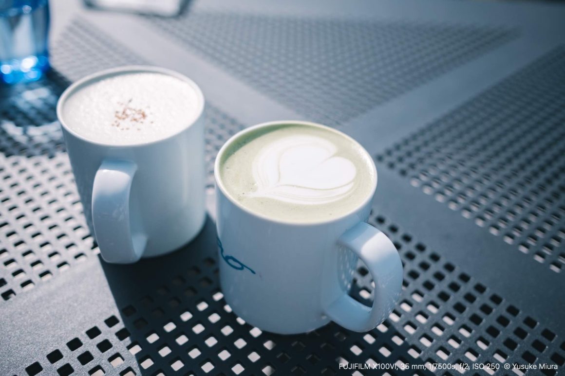 せっかく来たので、夫婦それぞれフードとドリンクをしっかり注文。風が強くてちょっと寒かったので、温かい飲み物がありがたい。僕は「抹茶ラテ」(750円 [税込])、妻は「そば茶豆乳ラテ」(650円 [税込])にしました。