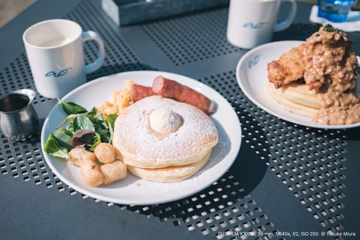 そして、おいしそうな食事も到着。僕は「バターミルクパンケーキ フライドチキンとメイプルベーコンソース」(1,680円 [税込])、妻は「バターミルクパンケーキ コンボプレート」(1,800円 [税込])です。