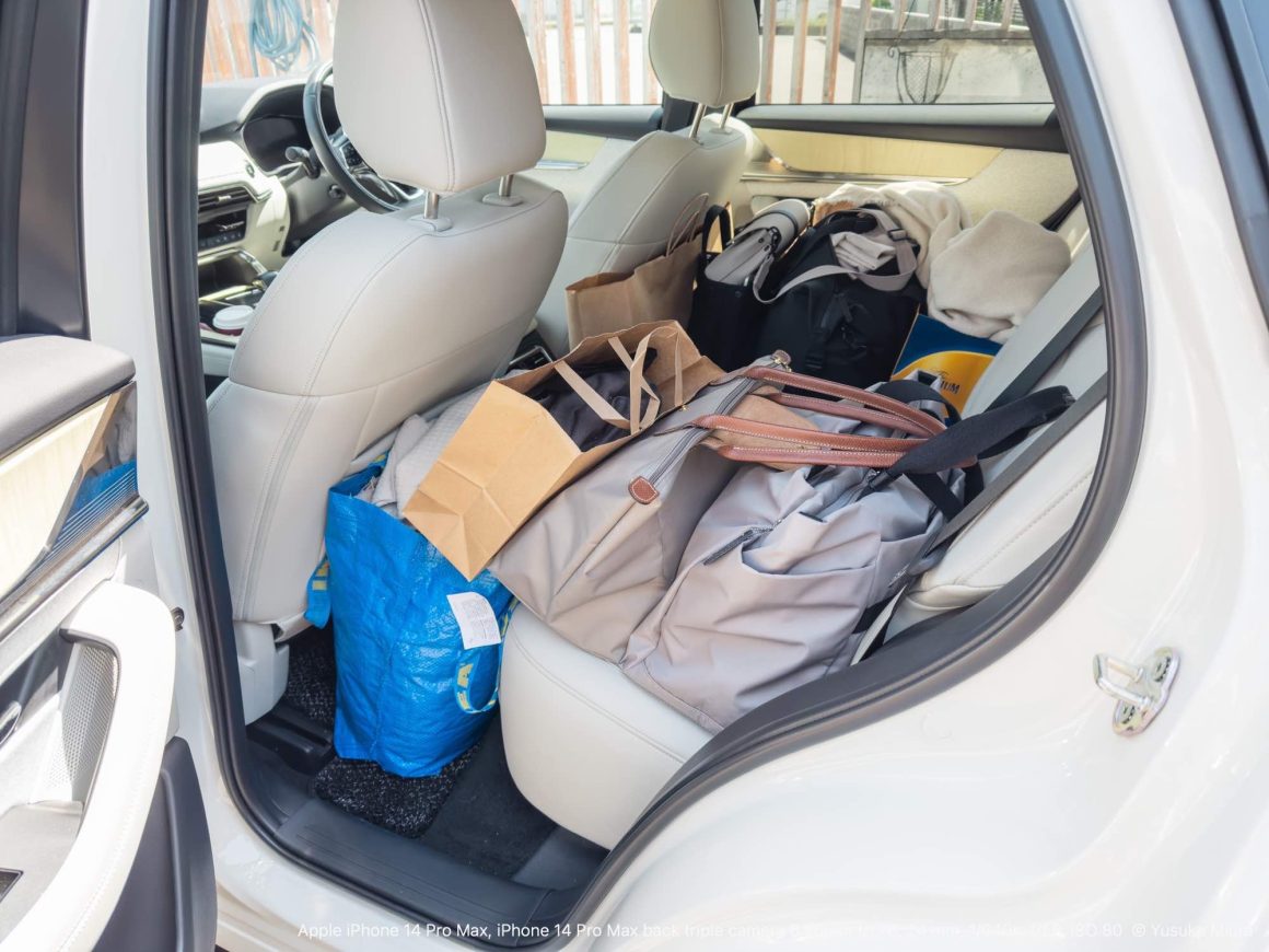 ちなみに、いつもこんな感じで荷物を積み込んでいます。後席の中央には犬が乗るので空けていて、後席の両側にそれぞれの荷物を積んでいる感じ。ラゲッジには犬用カートが入っているし、CX-60は2人と1匹の暮らしにジャストサイズです。