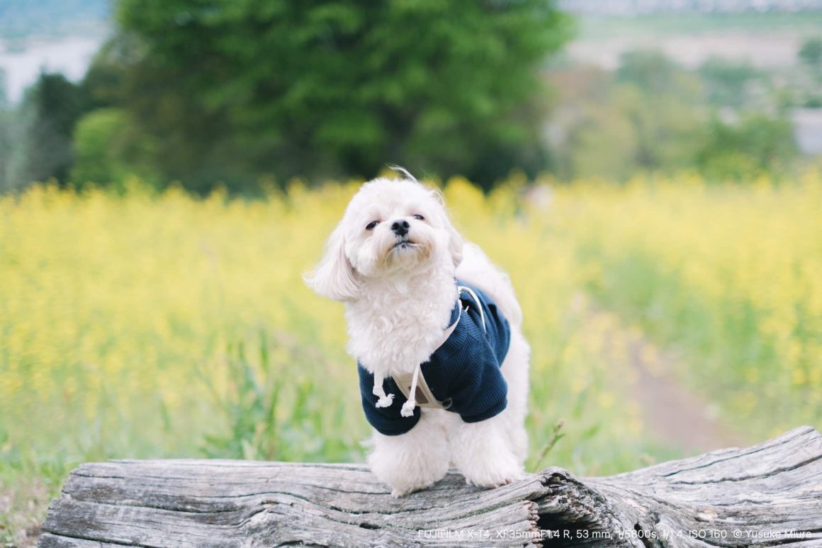 あとは、犬たちを木の上に乗せて写真を撮りました。あんまり乗り気じゃなさそうだったけど、かろうじてこっちを向いてくれている写真がありました。