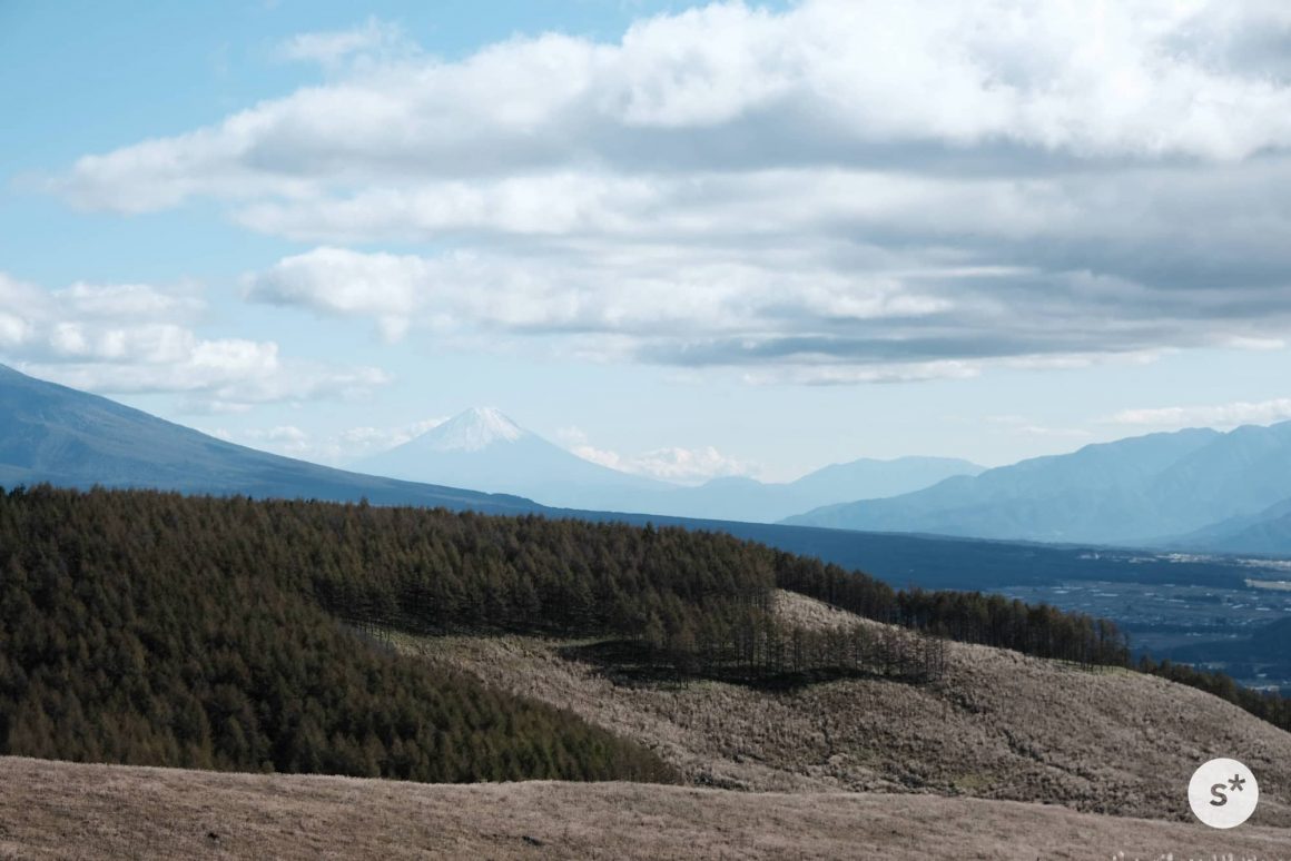 霧ヶ峰富士見台からは八ヶ岳、そしてその向こうに富士山が見えます。でもこの日は少し霞んでいて、富士山はくっきりと見えませんでした。また、八ヶ岳が紅葉で赤く染まっていたら完璧でしたが、まだ深い緑色でした。