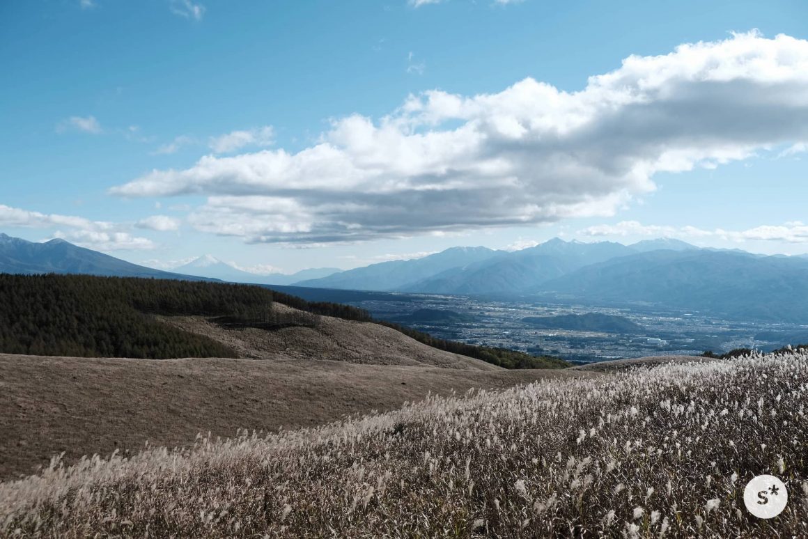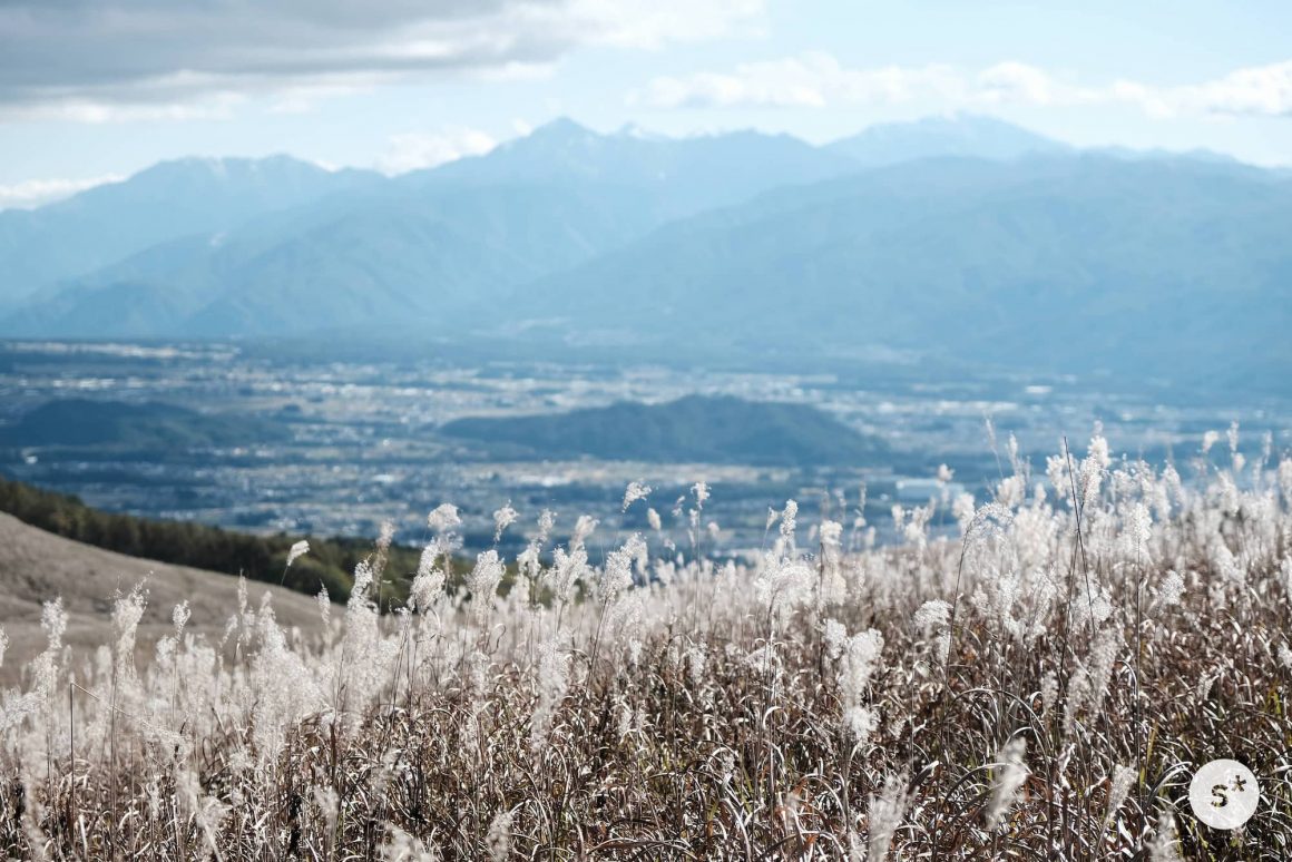 霧ヶ峰富士見台の目の前にもススキが広がっています。2年前に訪れたときはほとんど枯れていましたが、今回は辛うじて残っていました。また、眼下に広がっているのは、長野県茅野市あたりの街並みでしょうか。