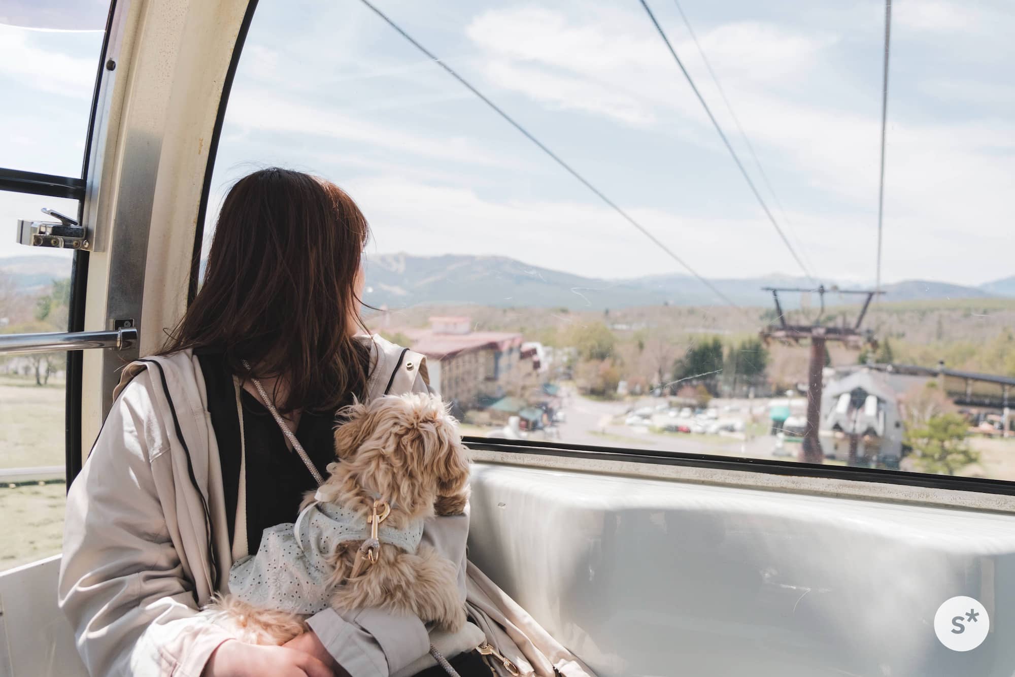 前日も乗ったけど、お店を探す時間稼ぎに、ゴンドラにでも乗って上から景色を見ておきましょう。ここのゴンドラも犬OKで、ケージフリーでそのまま乗り込むことができます。