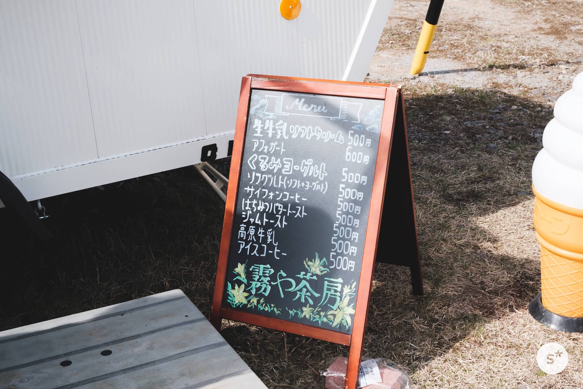とりあえず、以前五平餅を食べた霧ヶ峰富士見台を目指すことにしましたが、その少し手前で「生牛乳ソフトクリーム」の旗を発見。ちょうどソフトクリーム食べたいねと話していたので、迷うことなく車を止めました。