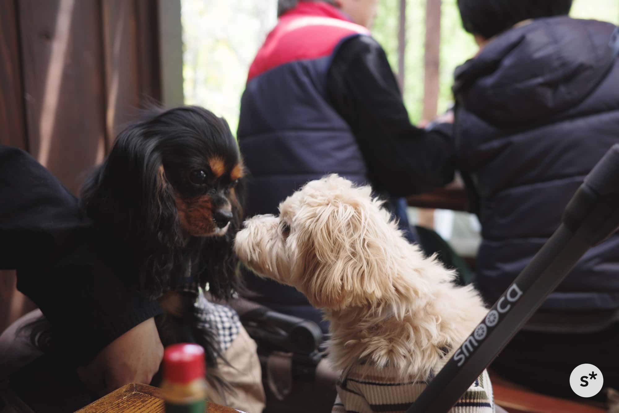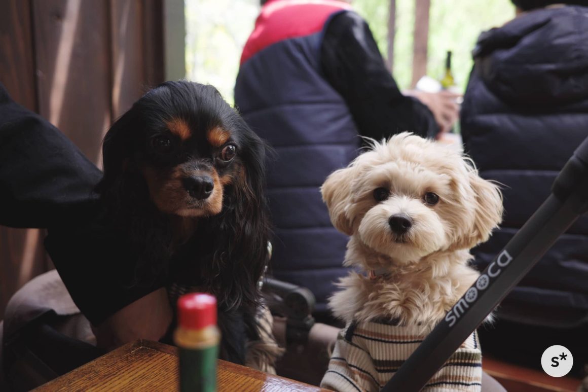 人間は何度も会っているので問題ないのですが……問題は犬たちです。本当はドッグラン付きのホテルで仲良くなって、その帰りにこの梅蔵さんに寄る予定だったのに、いきなりこんなところで初めての対面を果たしてしまいました。