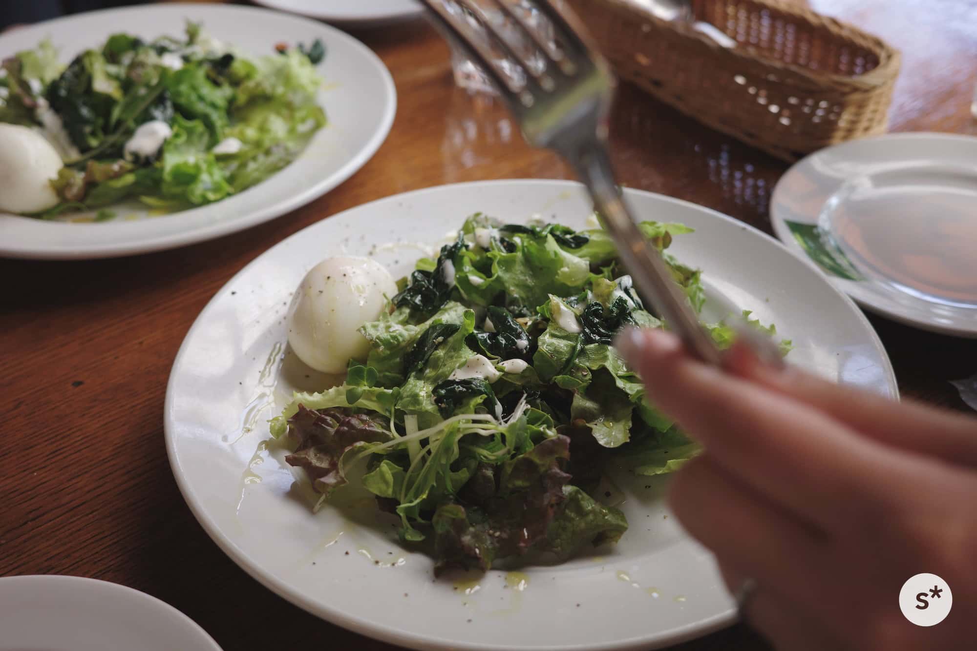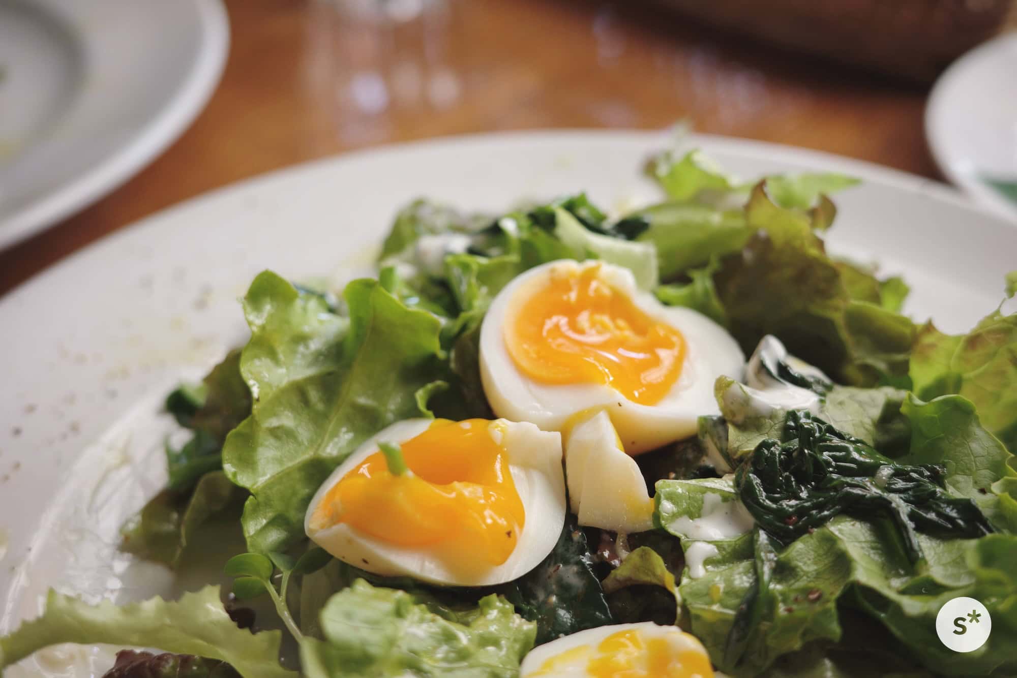 - サラダ:ほうれん草のソテーと半熟卵のサラダ