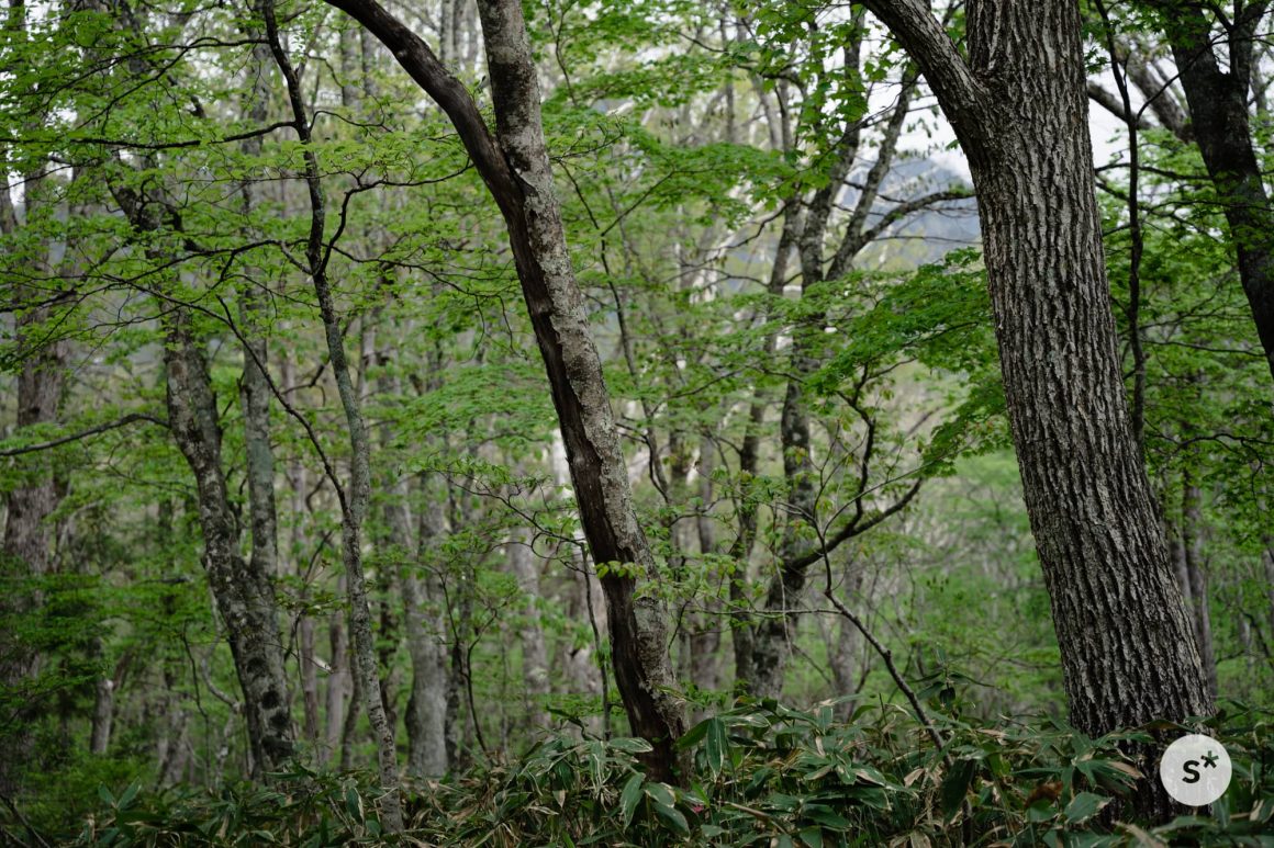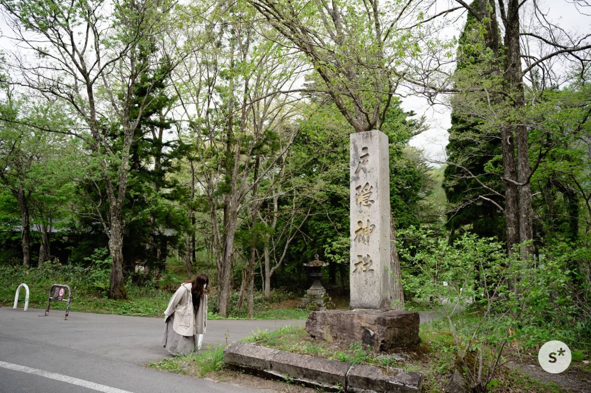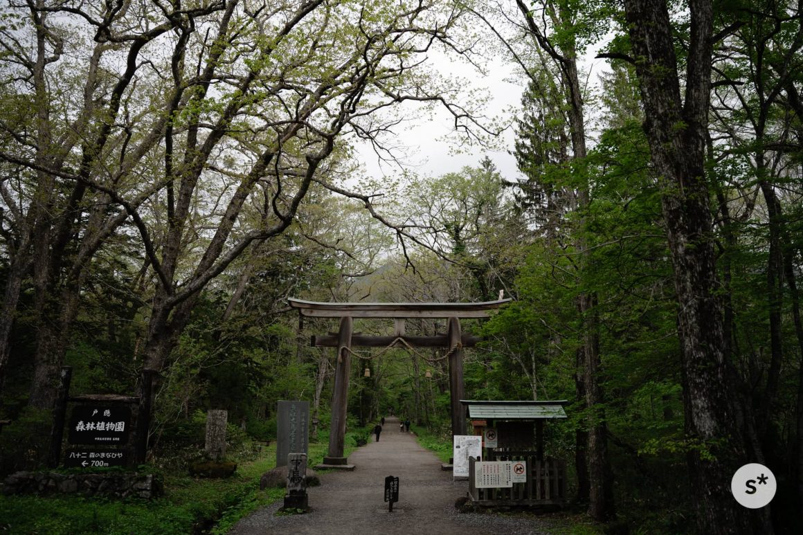 このあたりの標高は1,200mあまり。参道のそばには、ハルニレ、シナノキ、ブナなどの落葉樹、モミ、イチイ、ウラジロなど針葉樹からなる154,000坪に及ぶ広大な自然林が広がっており、標高が高いことを伺わせます。
