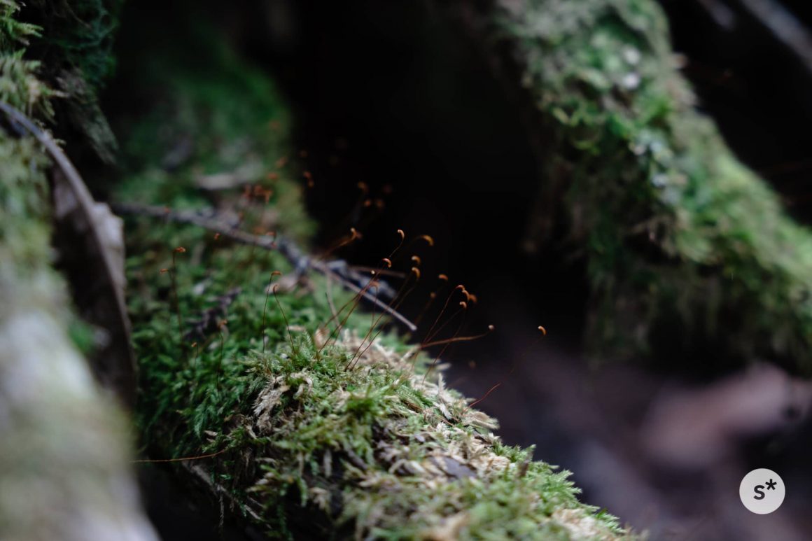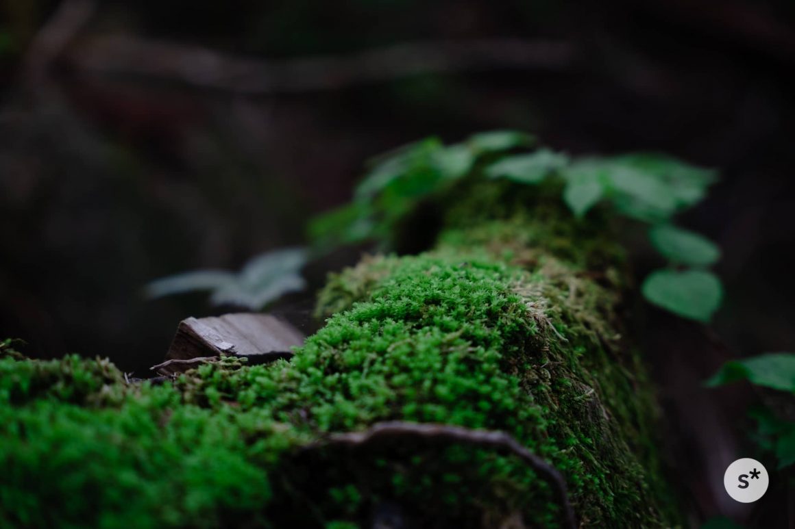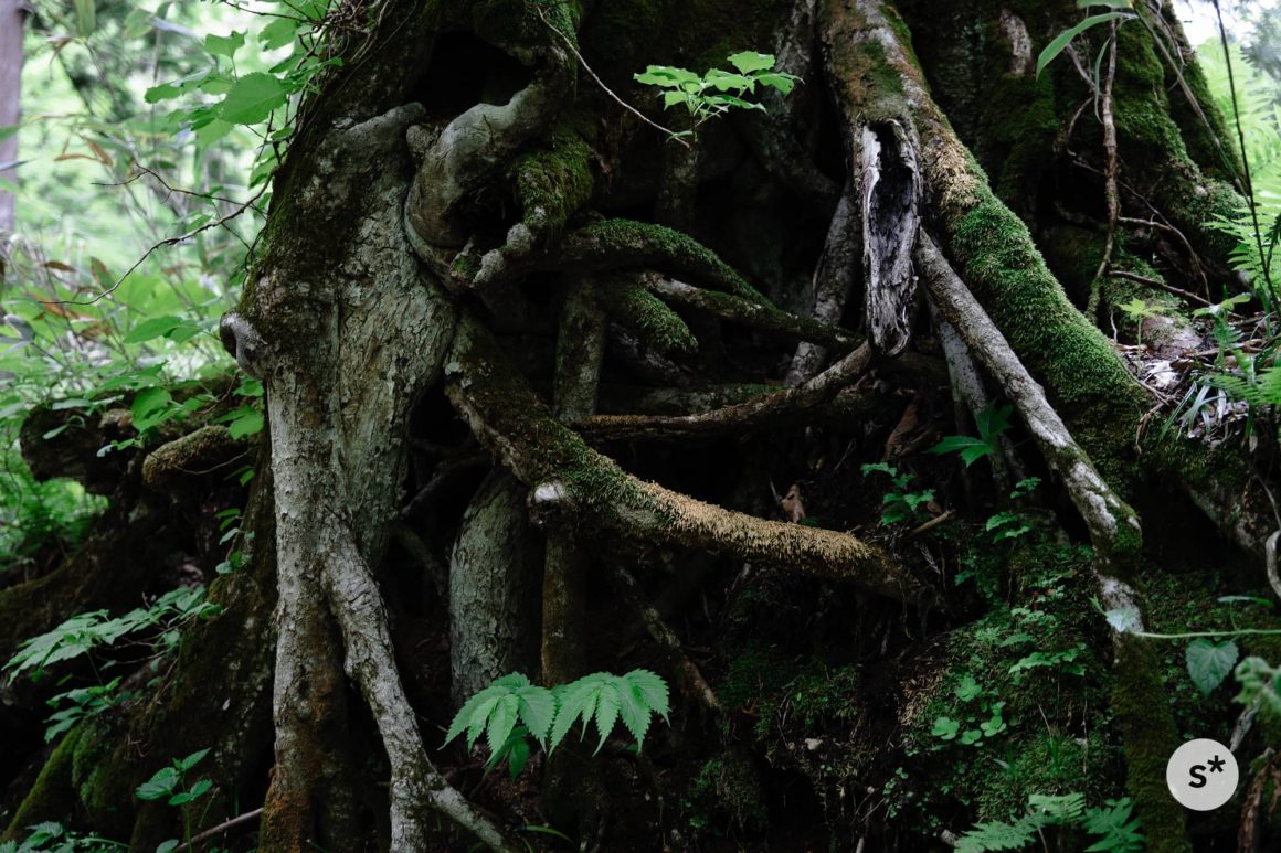 地面に出ている根の部分だけで人間の背丈ほどの高さがあります。根の上には苔や山菜が生えていました。大きな命の足下で小さな命が育っている。美しい光景です。