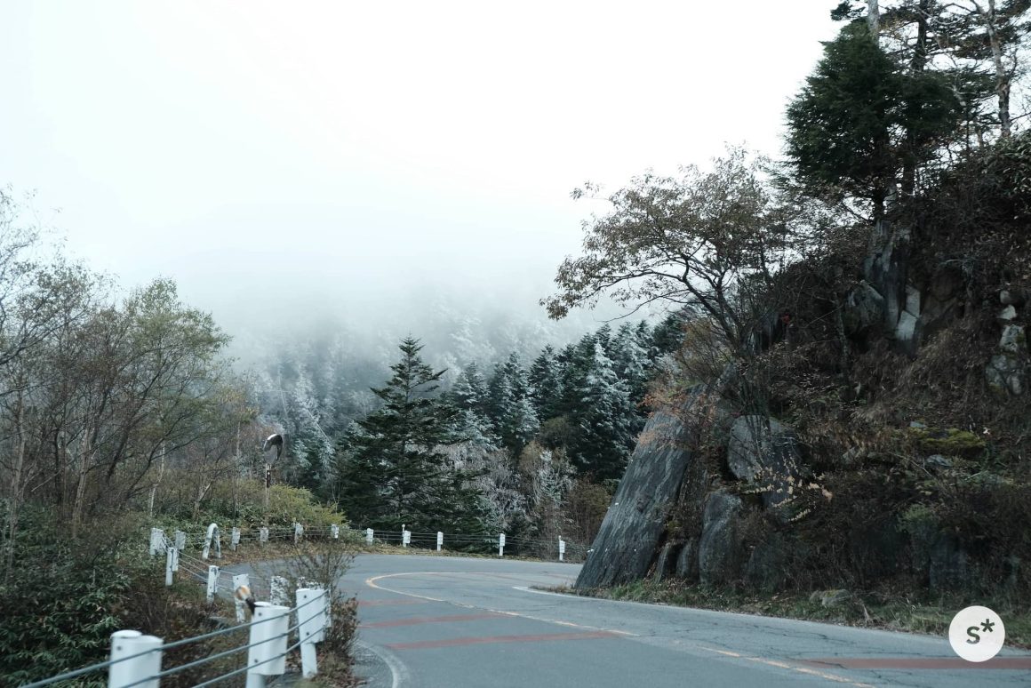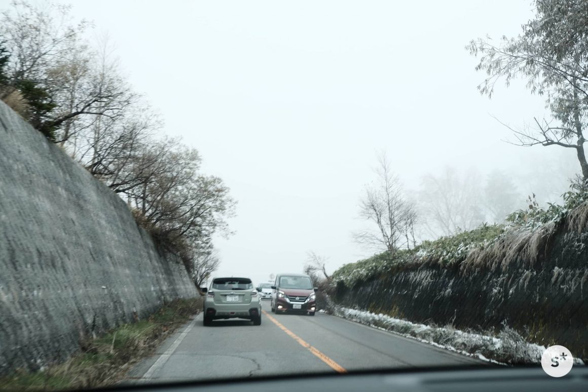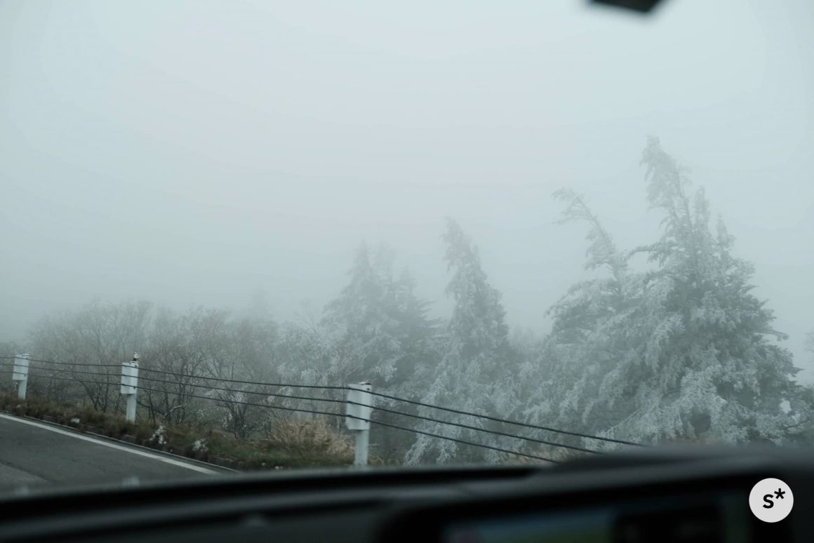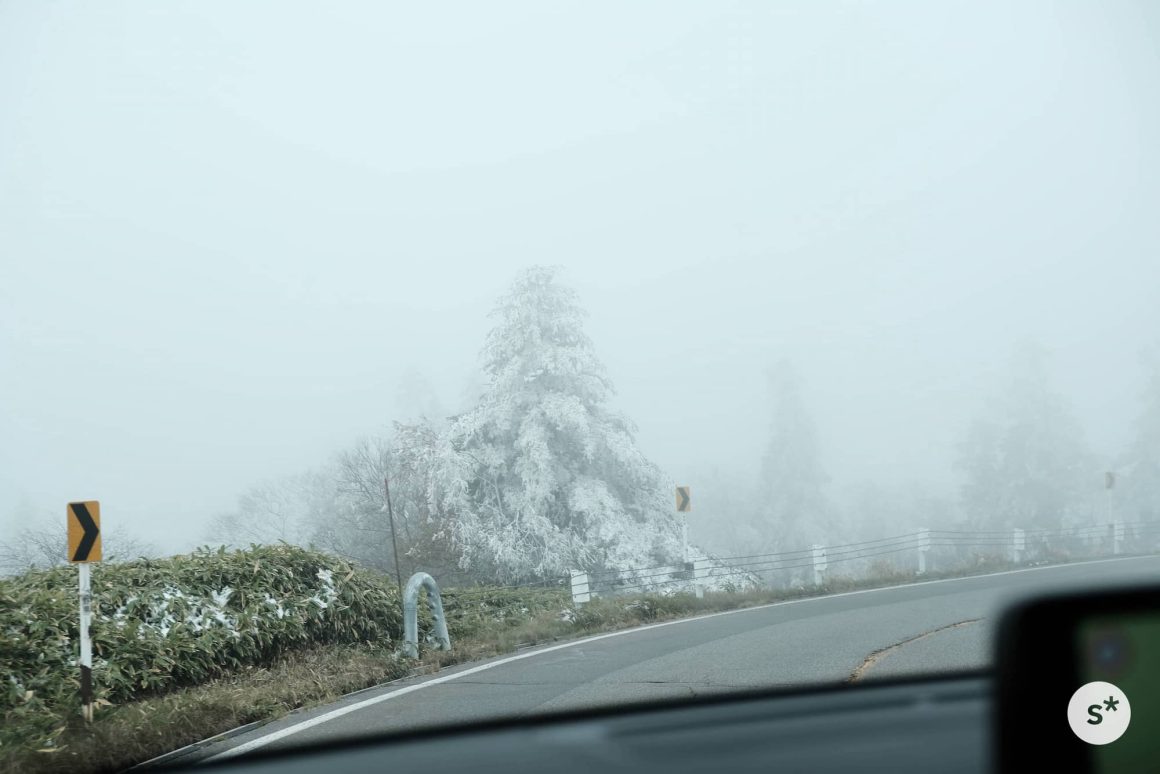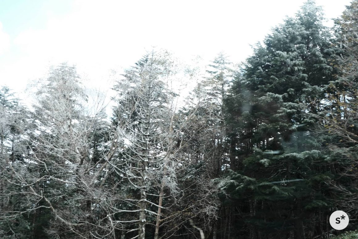 ところが、標高が上がるにつれて様相が一変します。木々には雪が積もっているし、霧まで出てきました。美しい紅葉が広がっていることを期待して訪れたけれど、秋なんて通り過ぎてしまっていました。