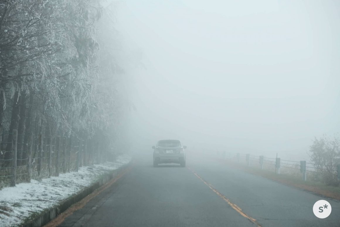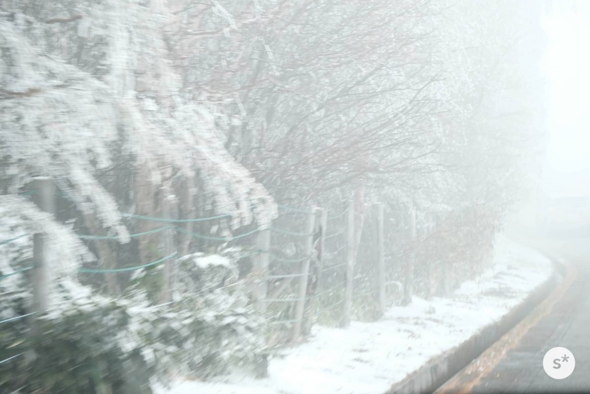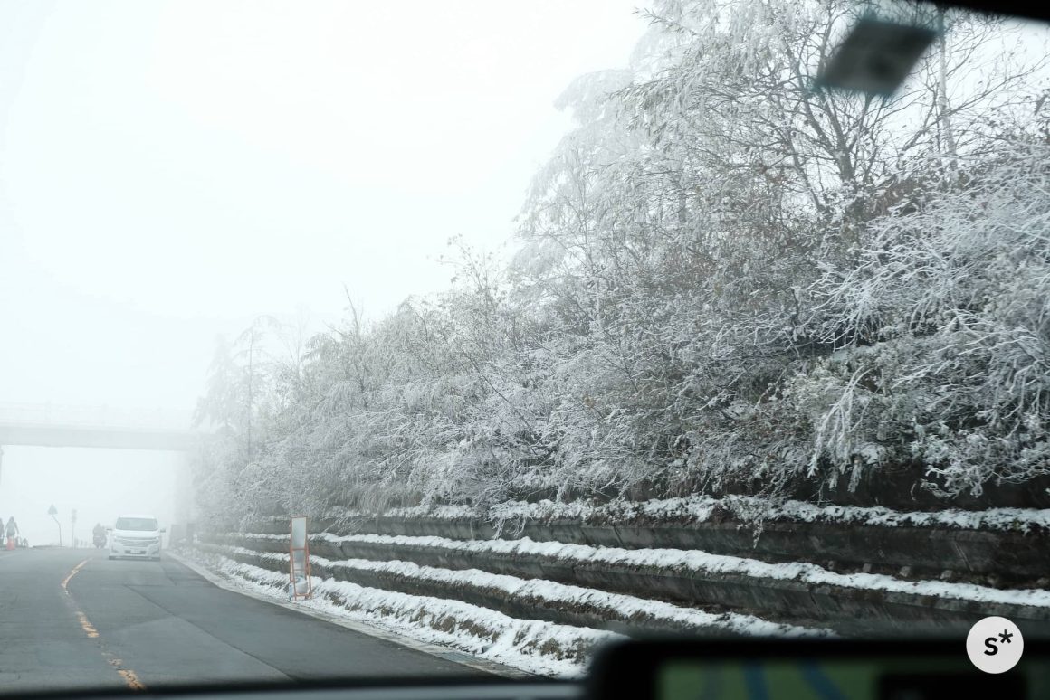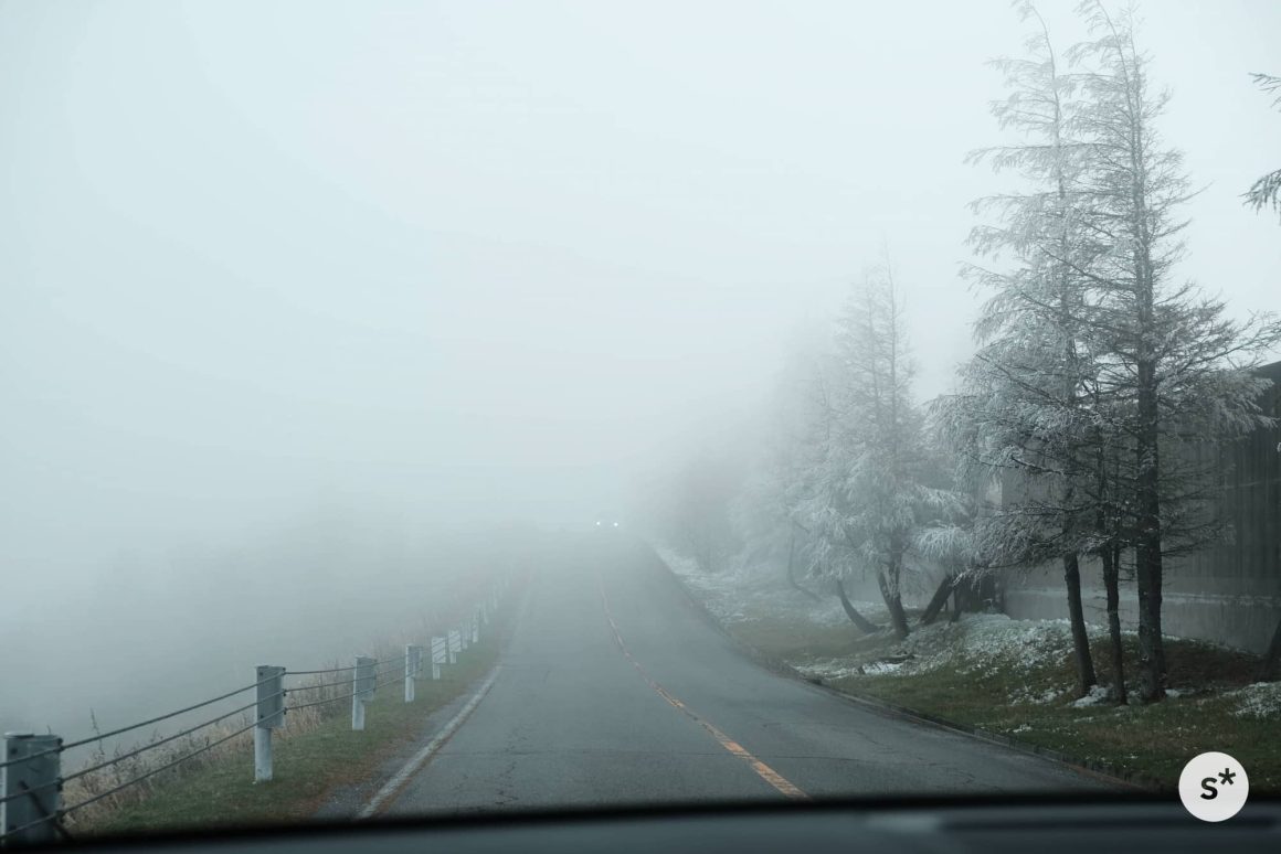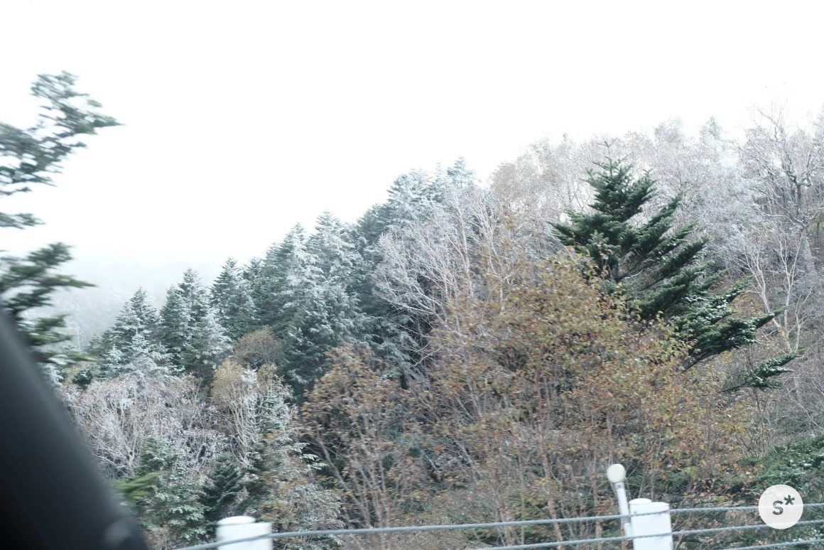 ところが、標高が上がるにつれて様相が一変します。木々には雪が積もっているし、霧まで出てきました。美しい紅葉が広がっていることを期待して訪れたけれど、秋なんて通り過ぎてしまっていました。