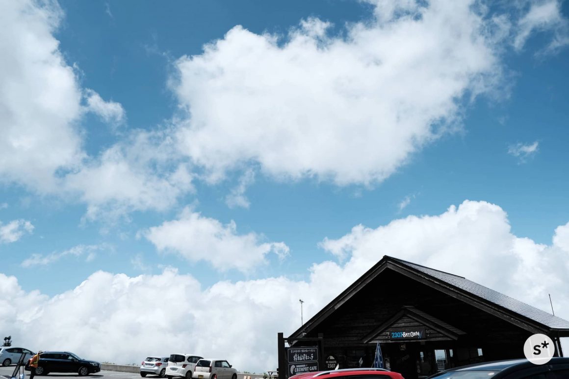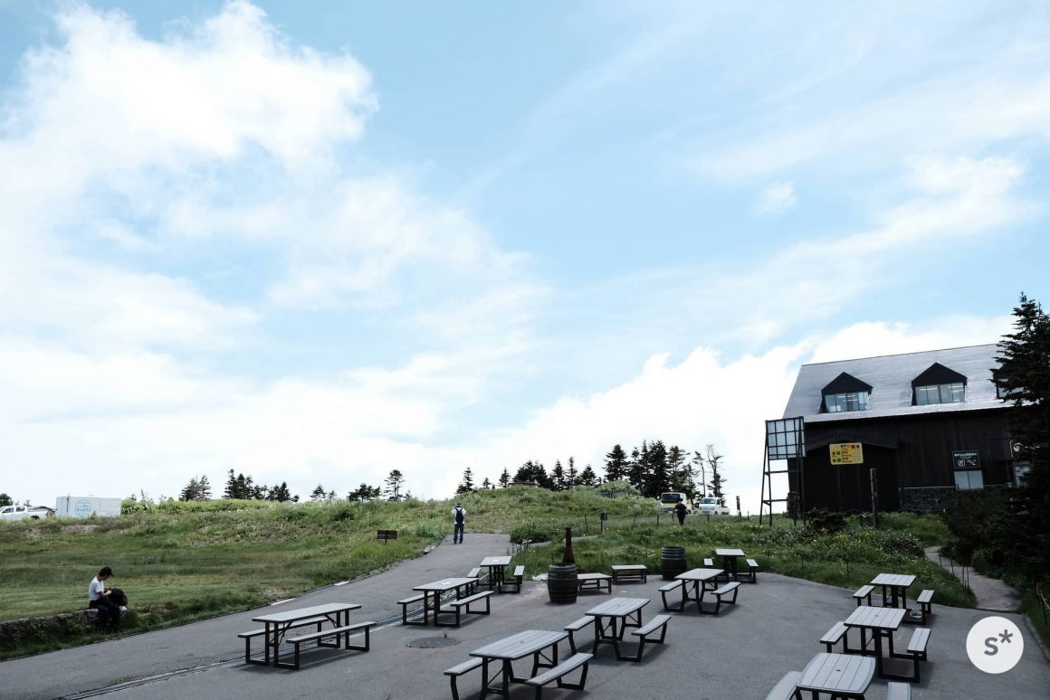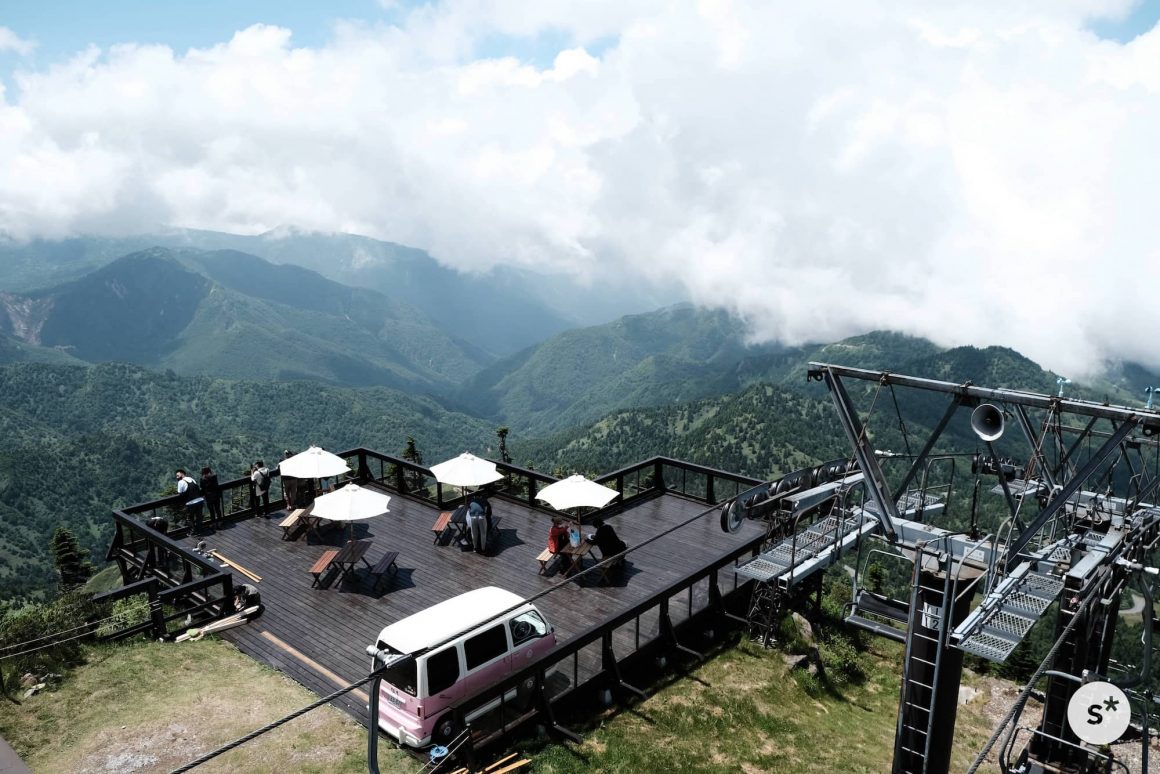 リフトに乗って標高2,307mの山頂に辿り着きました。山頂にある「満天ビューテラス」は、訪れた数日前にオープンしたばかりだったようで、ところどころまだ作業中でした。