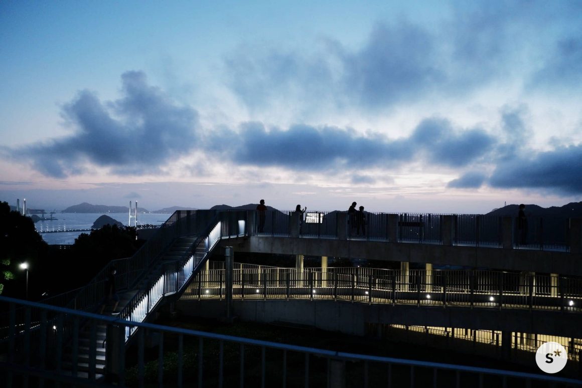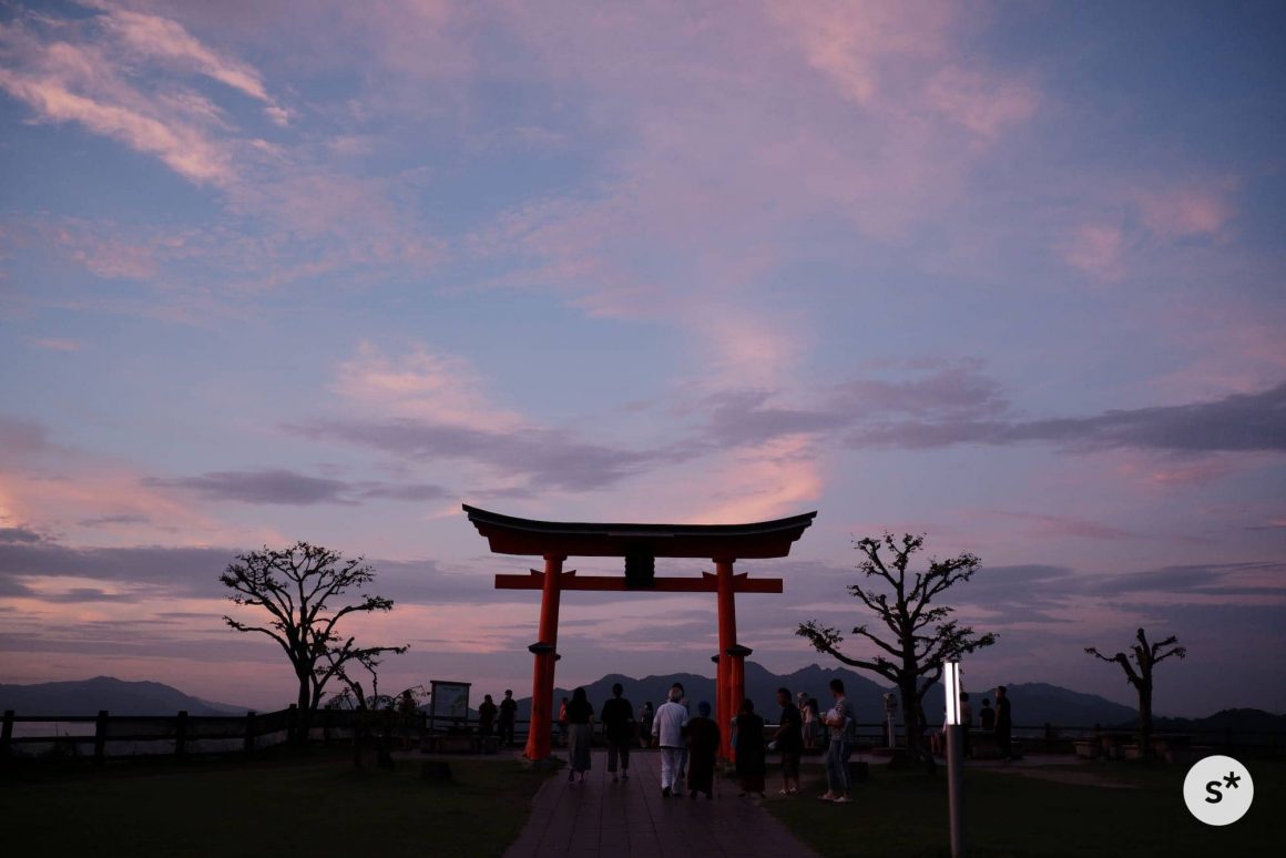 宮島SAには、厳島神社に見立てた交通安全の鳥居があります。その先が展望所になっていて、夜明けを待ち望んだかのように多くの人々が現れては、写真を撮ったり、この景色を家族で楽しんだり。