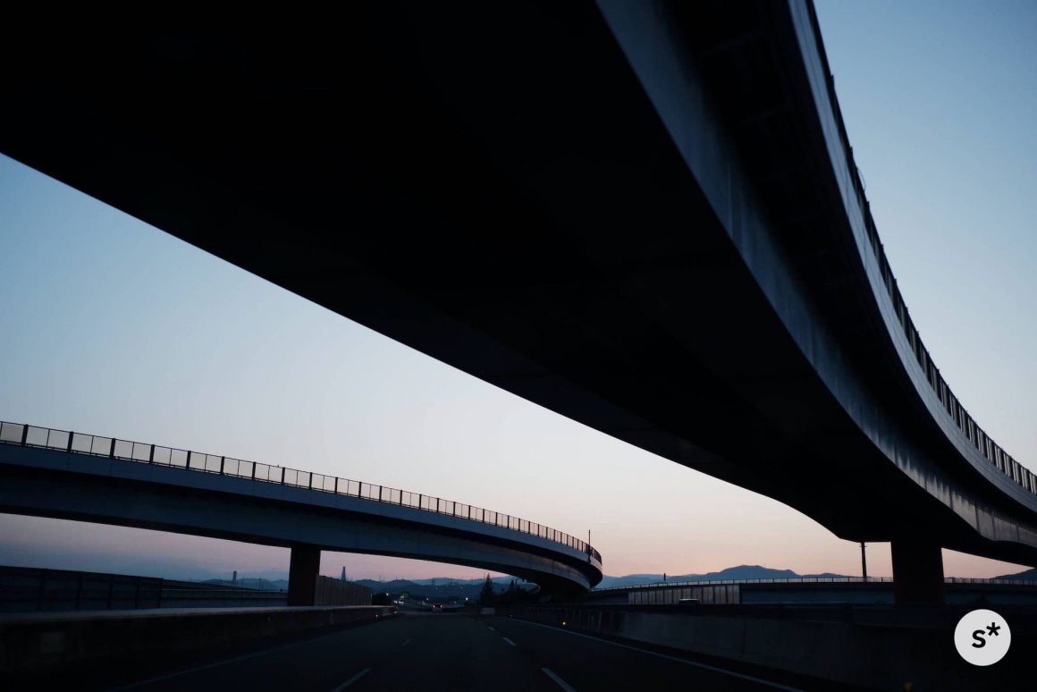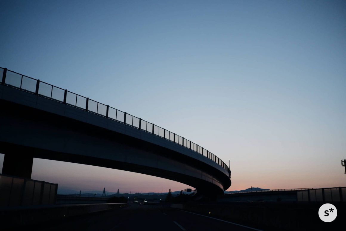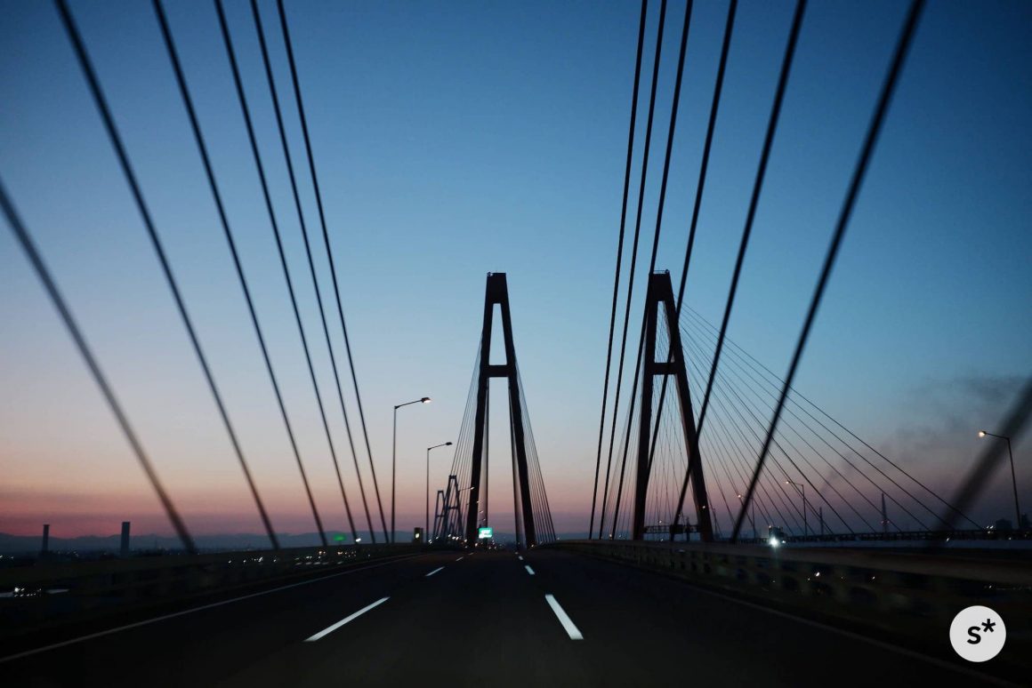 行きと同じように夜8時頃に長崎を出発し、朝焼けを迎えたのは名古屋でした。ちょうど、伊勢湾岸自動車道の橋が連続する区間、いわゆる「名港トリトン」を通り過ぎるタイミング。