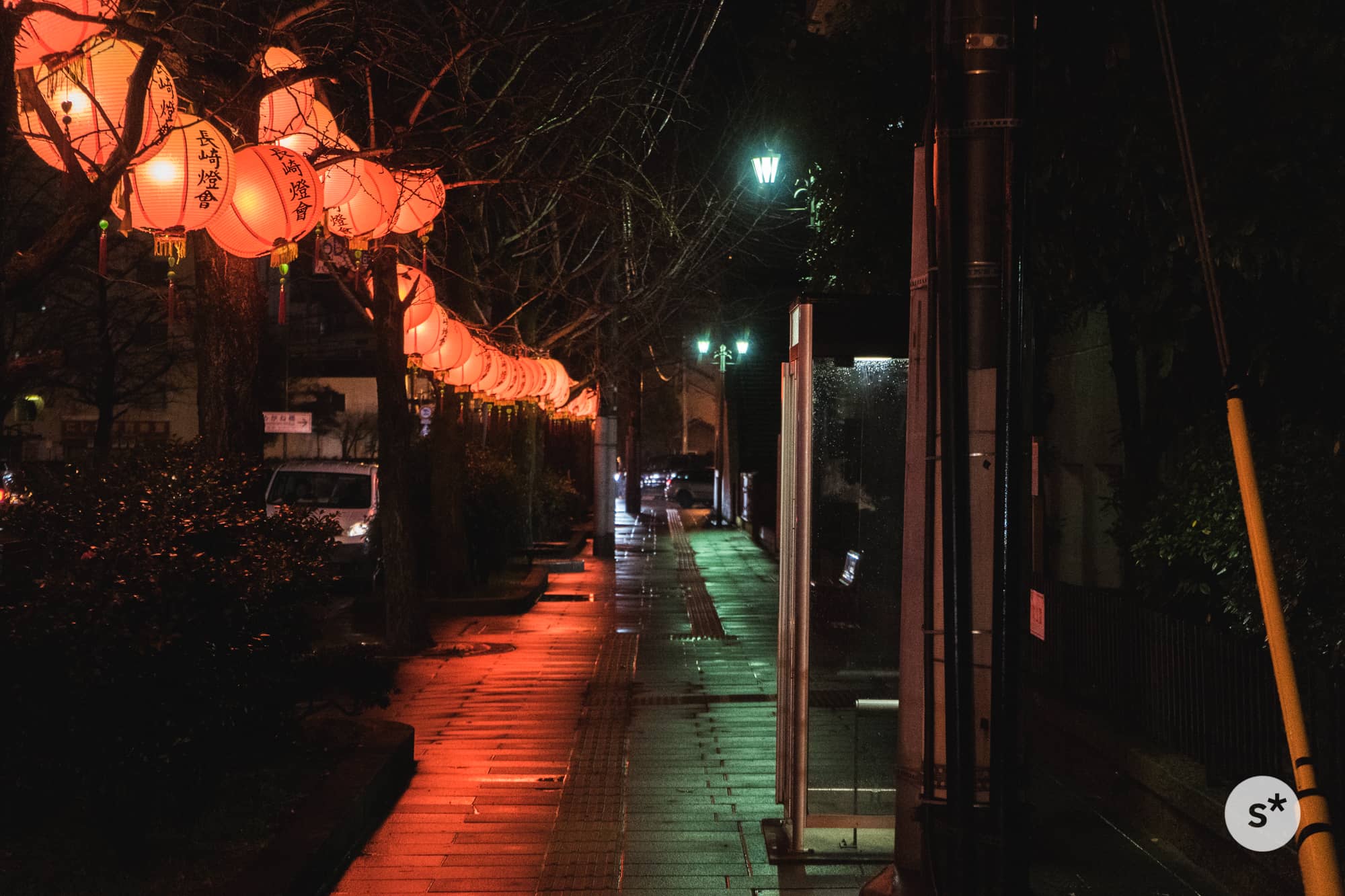 川の周りは大勢の人が集まるけど、一歩路地に入ると住宅が建ち並びます。人通りはまばらですが、誰のためでもないランタンの光が、淡々と道路を照らします。