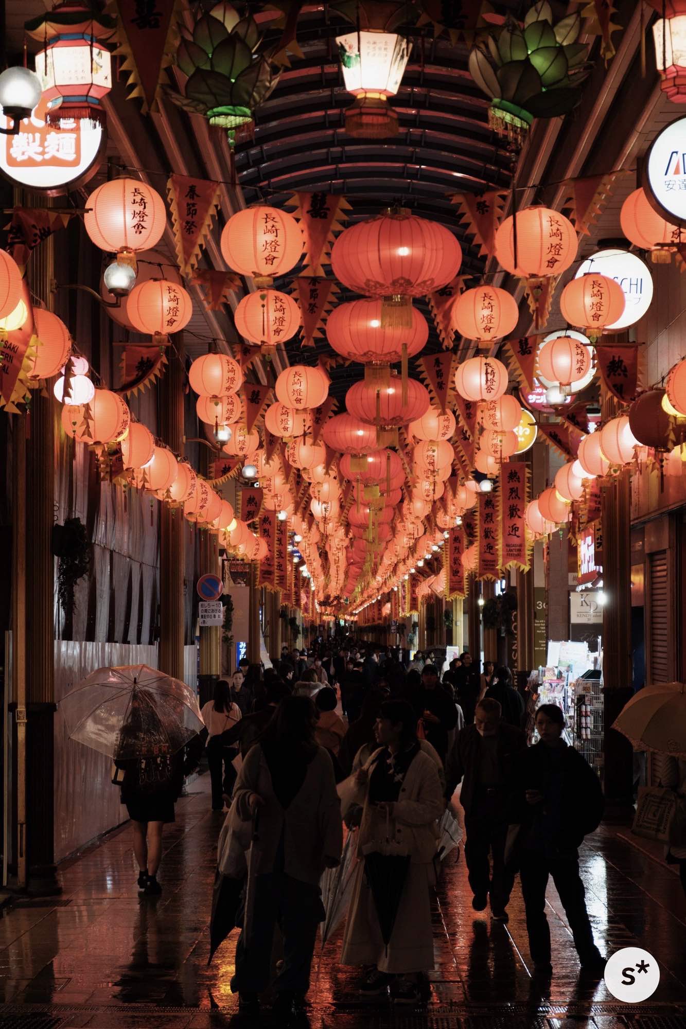 ここで反対方向を振り返るとアーケード街となっているのですが、そこにはランタンがずーっと続いていて圧巻の景色が広がっています。雨を避けられてちょうどいいので、アーケードを進んでみます。