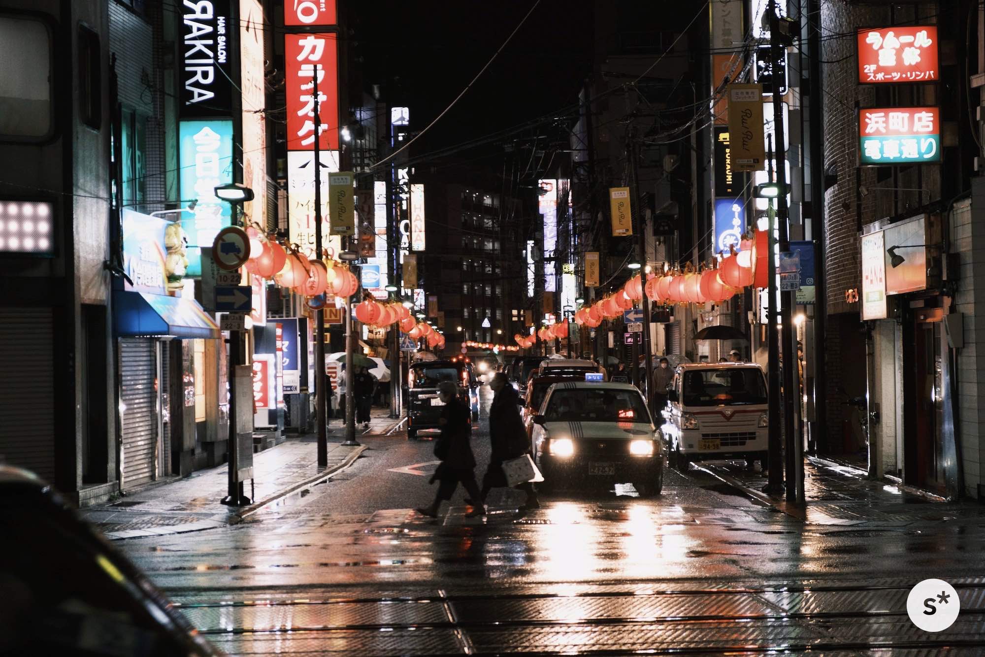 人が通り過ぎるのを待ってシャッターを切ります。濡れた地面に赤い光が反射するのもまたよし。