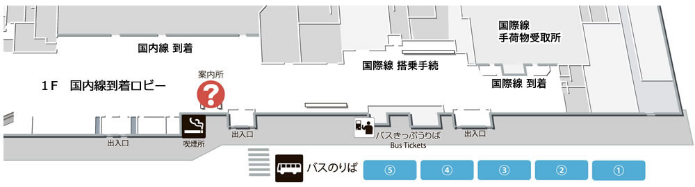 国内線の到着ロビー出口から外に出て左に向かうと、バス乗り場があります。そこで乗車券を買いましょう。長崎市内行きのバスは④番・⑤番乗り場から出ます。