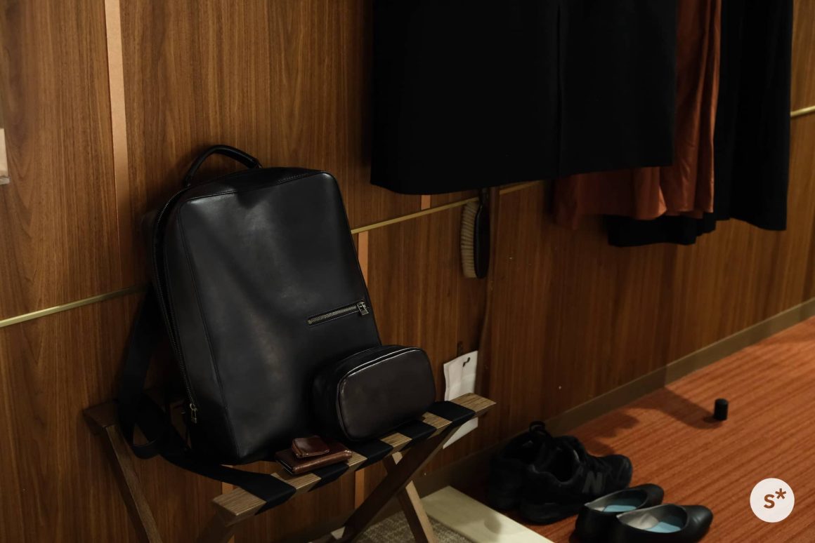 ホテルの部屋の壁紙が木目調で、マザーハウスのアンティークスクエアバックパックと雰囲気がぴったりだったので撮りました。最近使い込んでいるのでだいぶ経年変化してきて、いい味が出てますね。これは本当に買ってよかった。