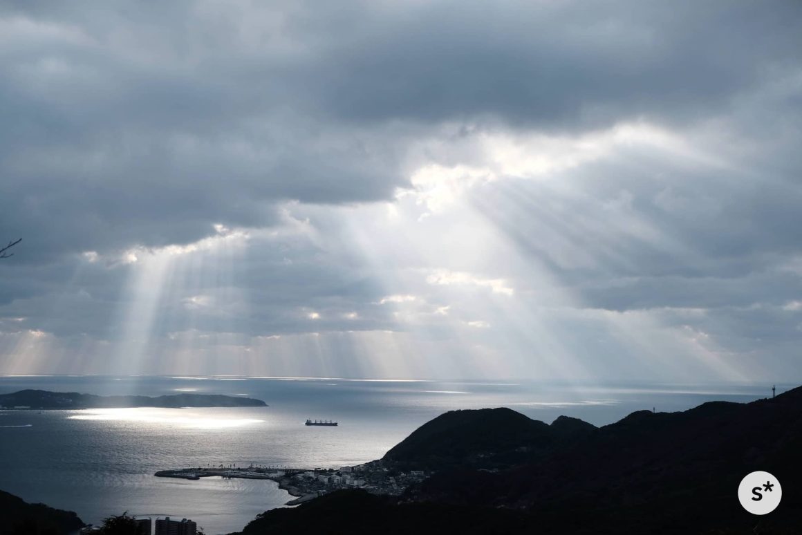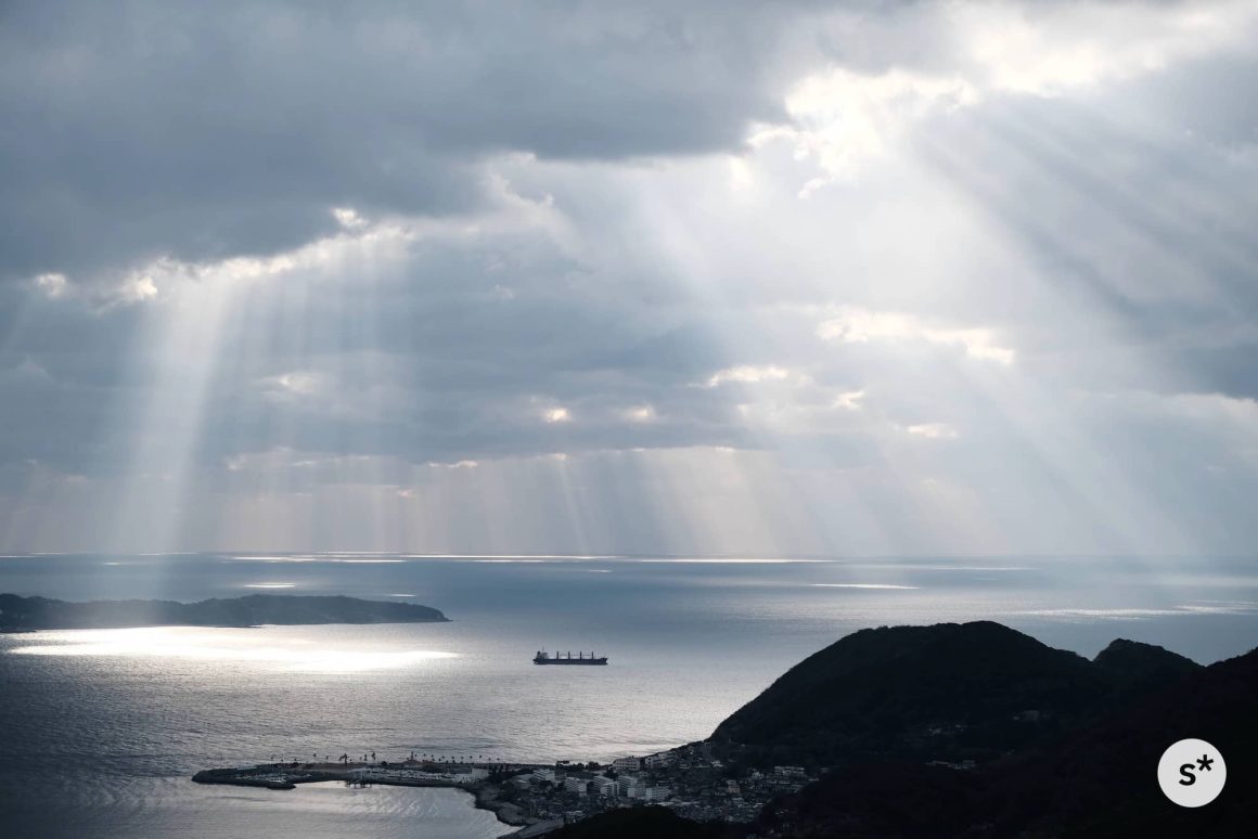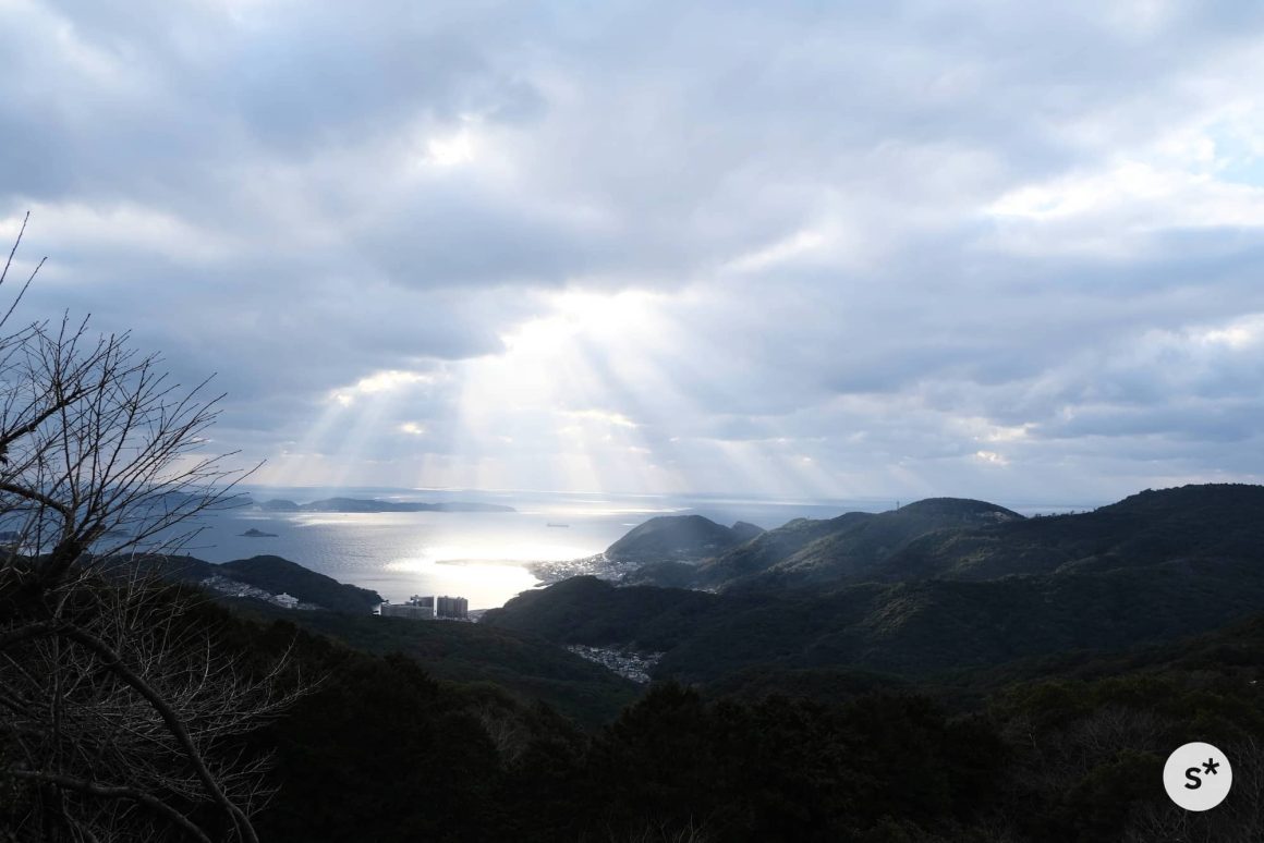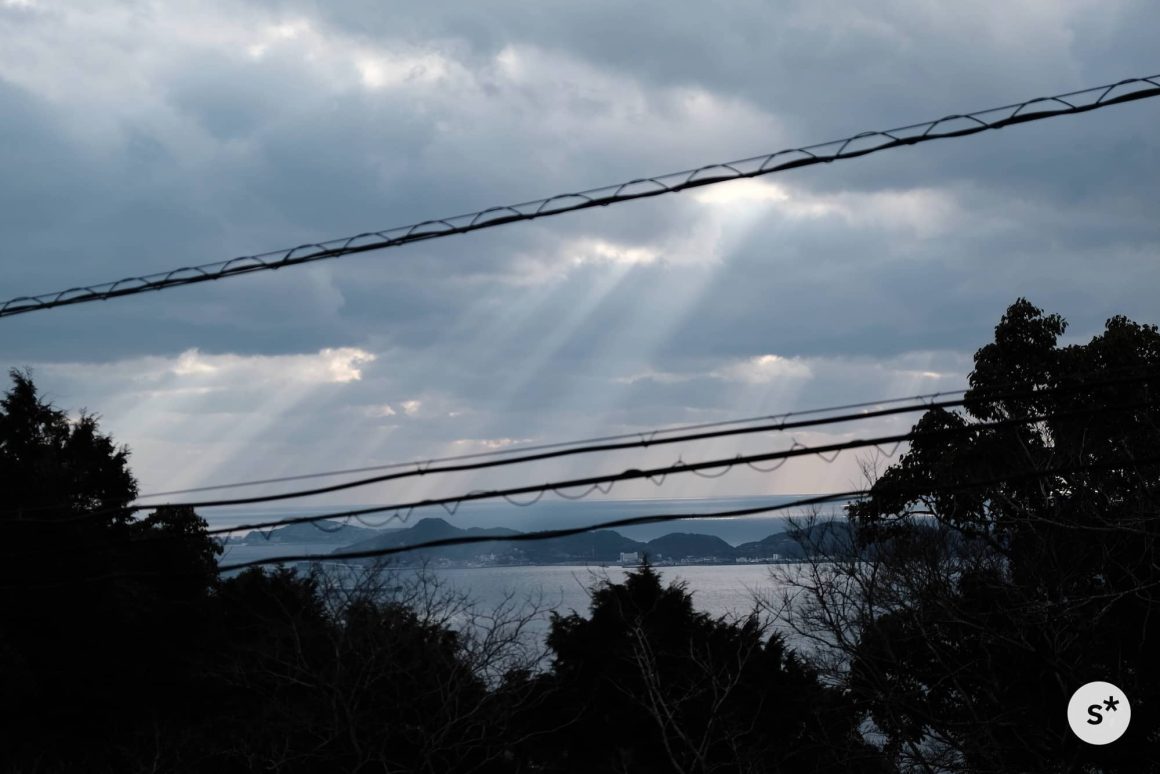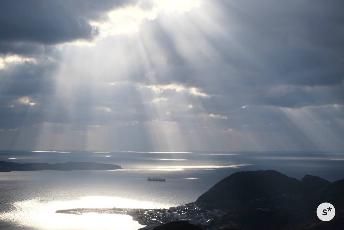 ずーっと向こうの方まで海の上に光芒が続いていました。雲の動きに合わせて、刻一刻と形が変わっていきます。これはいいものを見れました。登ってきてよかった!