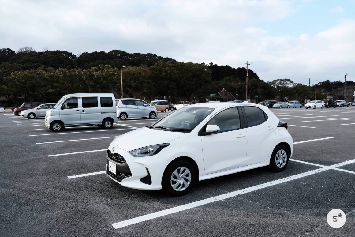 特に車種は指定しませんでしたが、割り当てられたのは現行トヨタ・ヤリス。色やホイールなど、一目でレンタカーだと分かるような見た目…!(羽田まで乗ってきたCX-5が恋しくなっていました)