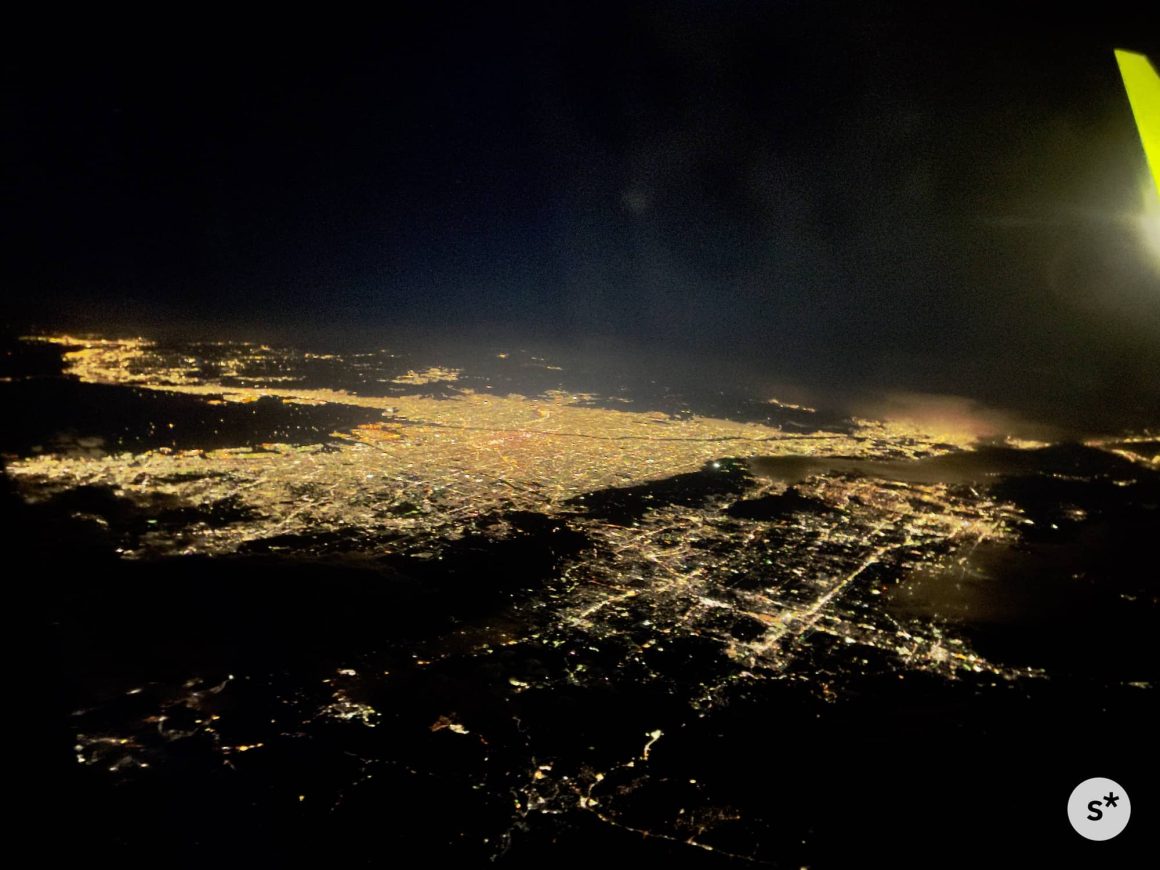 この日は天気がよく、煌々と輝く満天の夜景を上空から楽しむことができる、絶好の空旅日和でした。夜景が見えるのは左側の席でしたが、僕らは右側に座っていたので、首を伸ばしてがんばっていました。すると、CAさんから左側に座ってもいいと言われ、お言葉に甘えて移動しました。