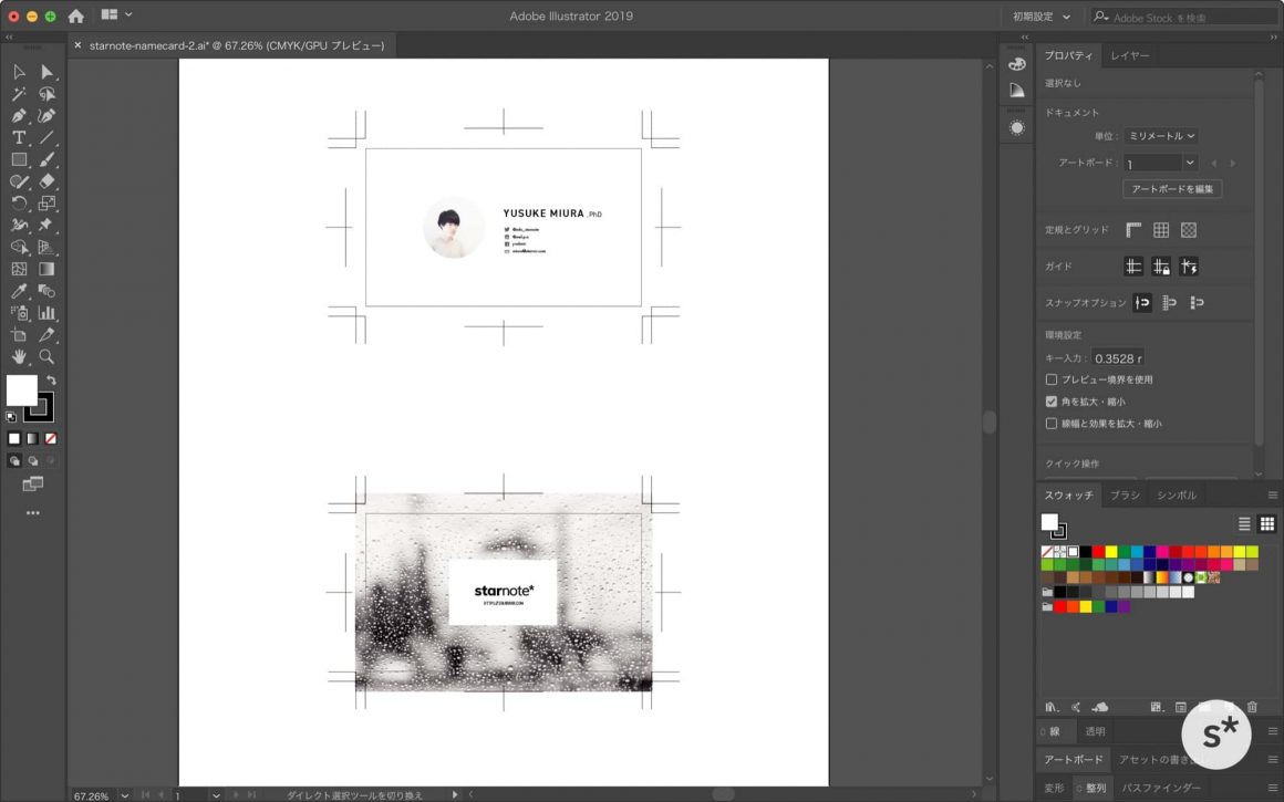 Illustratorで欧米名刺サイズ(89ミリ×51ミリ)の枠を作ってデザインしていきました。といってもバランスよく配置していくだけの作業なのですが、今回はミニマルな感じにしたかったので、全体的に文字を小さめにして余白を多めにとりました。