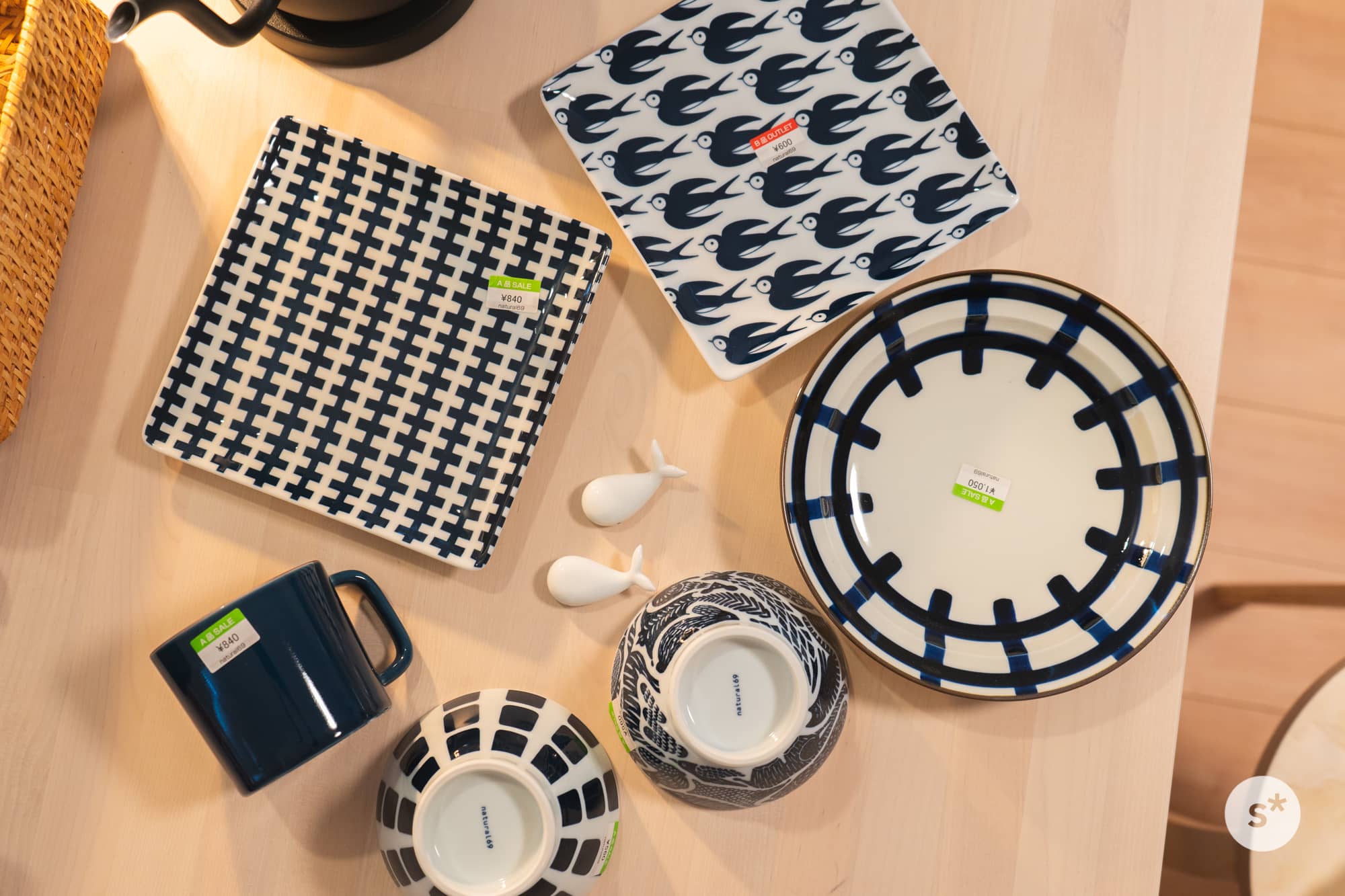 ツバメ模様の角皿だけがアウトレット品で通常の半額(1,200円→600円)。その他は市場流通品と同じクオリティですが定価より数百円安くなっています。