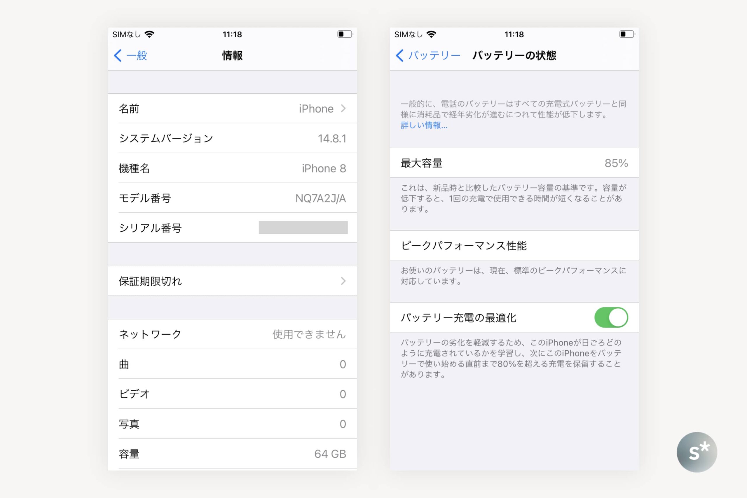 ちなみに、この個体は iOS 14.8.1 、バッテリー最大容量は85%でした。2年使った僕の iPhone 12 Pro Max も88%なので、バッテリーの状態は相応といったところでしょう。