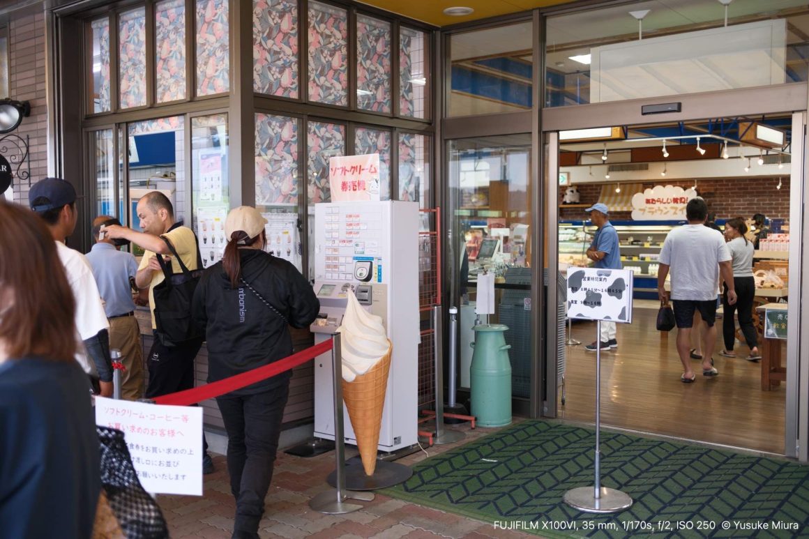 ソフトクリームは外の売店で売られています。横にある券売機で買ってから、受け取りの列に並びます。この券売機はSuicaにも対応。