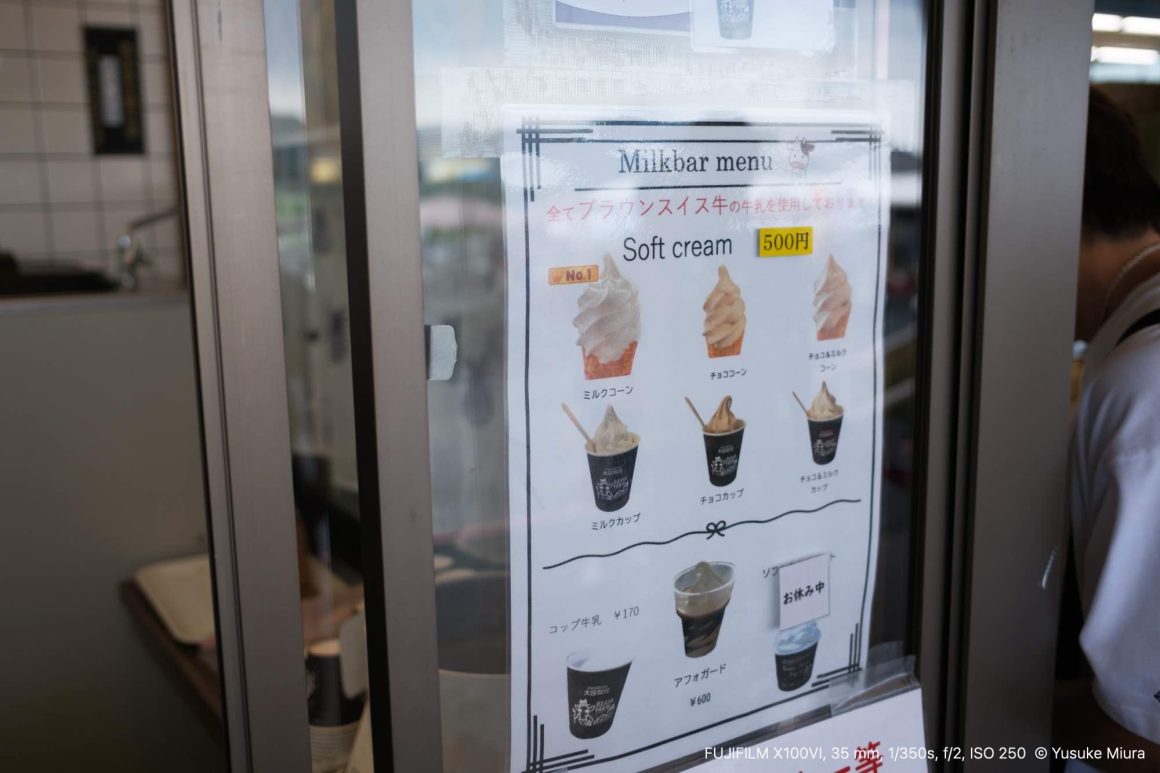 種類はミルク、チョコ、チョコ&ミルクの3種類。それぞれ、カップとコーンが選べます。せっかくのおいしいソフトクリームだから、いつも冒険せずに定番のミルクにしちゃうんですよね。そろそろ他の種類も試してみたいね。