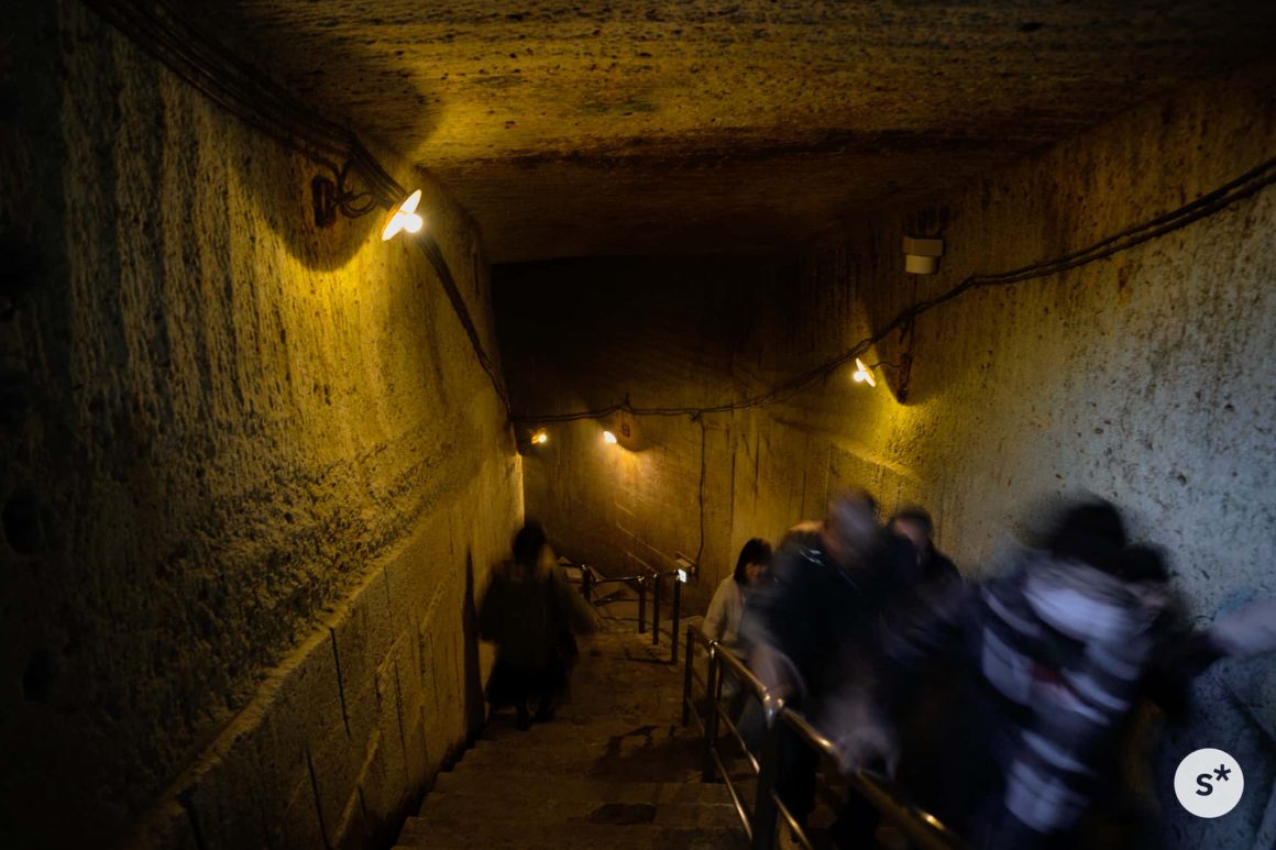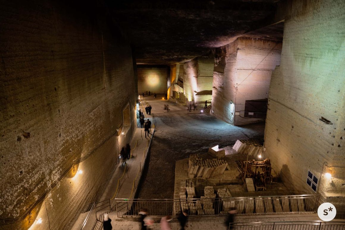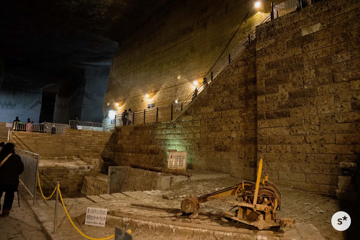 地層が水平に対して斜めに走っているので、石材として適している石を得るために、地中の奥へ奥へと掘り進めていった結果、地下に巨大な空間ができたそうで。