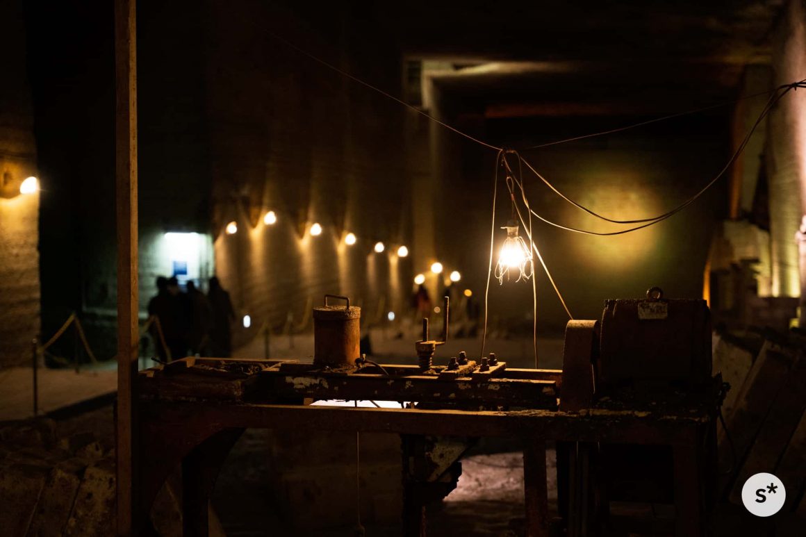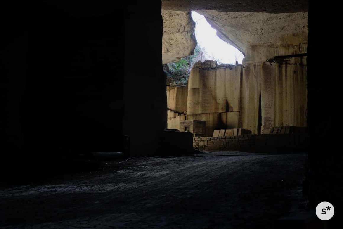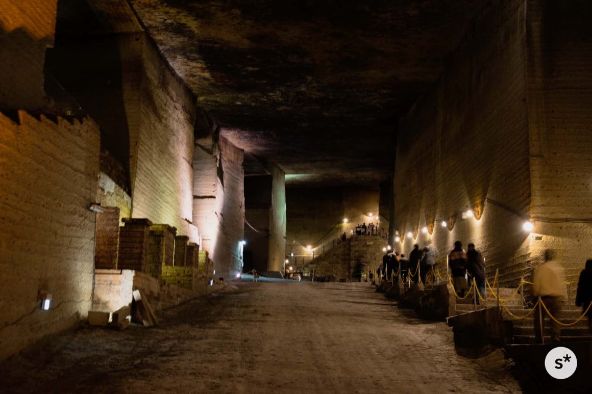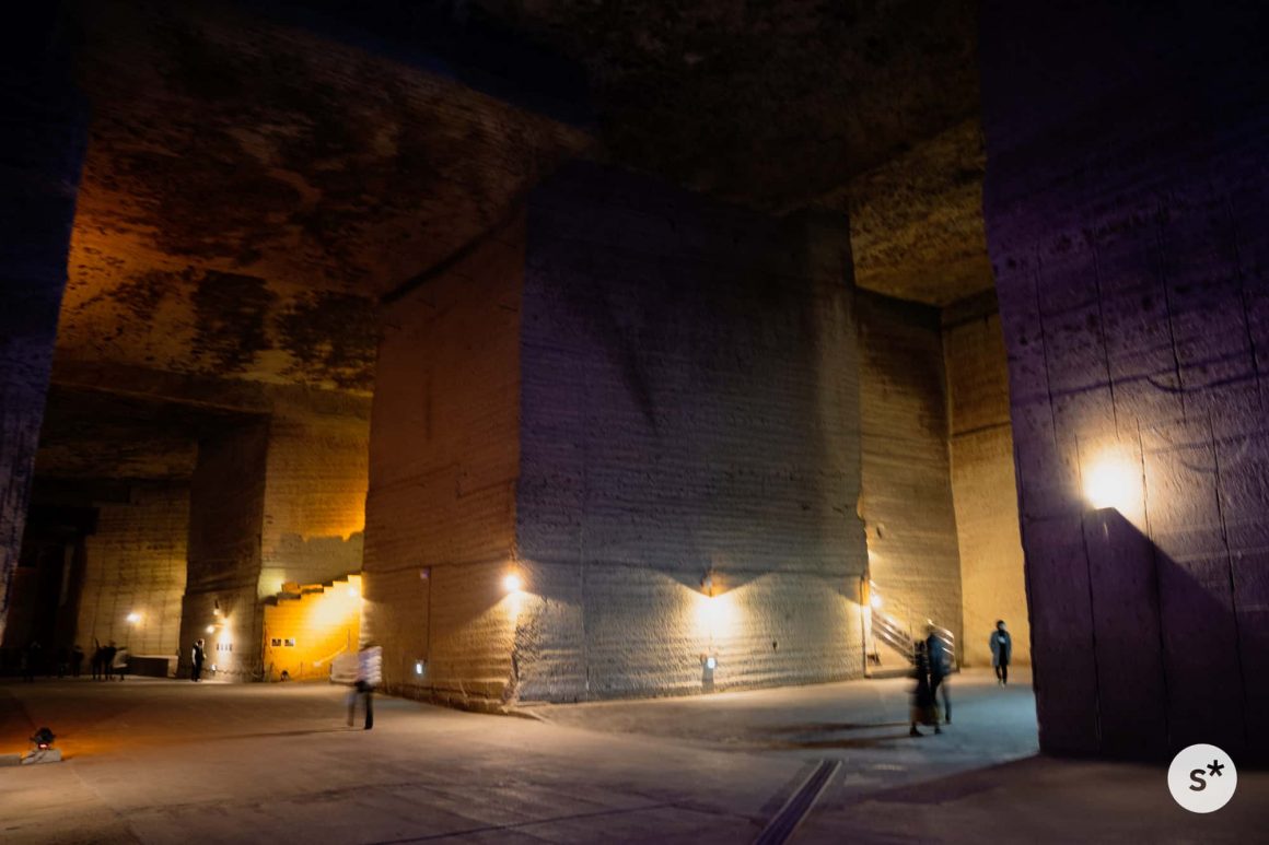 地層が水平に対して斜めに走っているので、石材として適している石を得るために、地中の奥へ奥へと掘り進めていった結果、地下に巨大な空間ができたそうで。