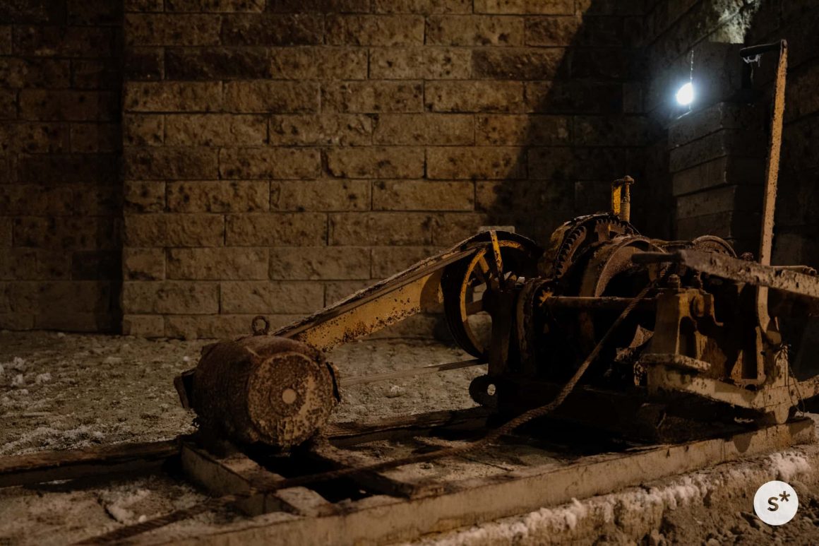 掘った石を釣り上げるウインチ。