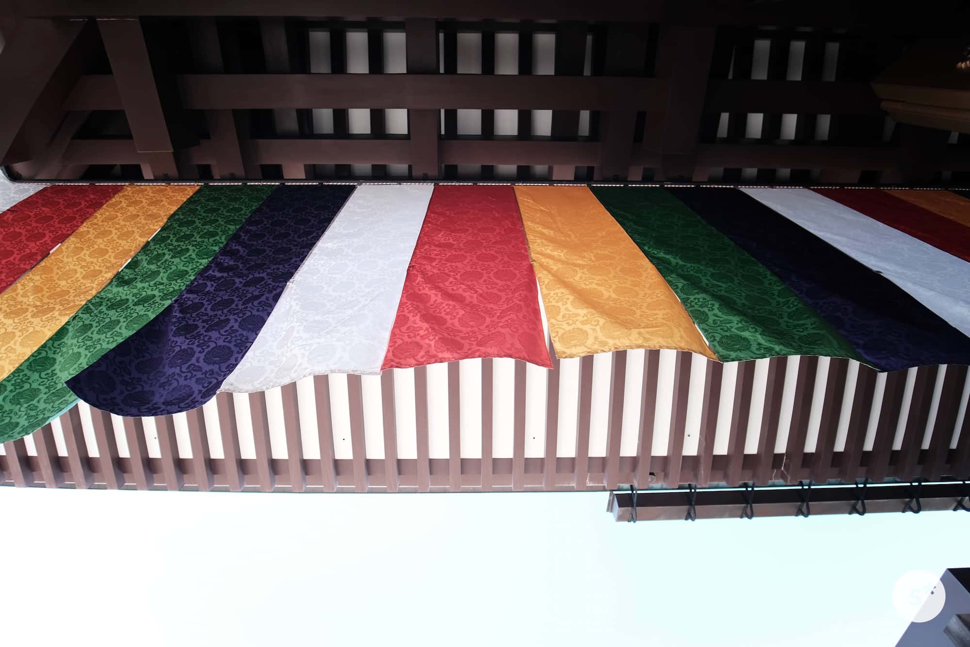 カラフルな布(これ何と言うんでしょう)が風でなびいてきれいだったので、真下から撮りました。超広角レンズのおかげでいい感じになったね。
