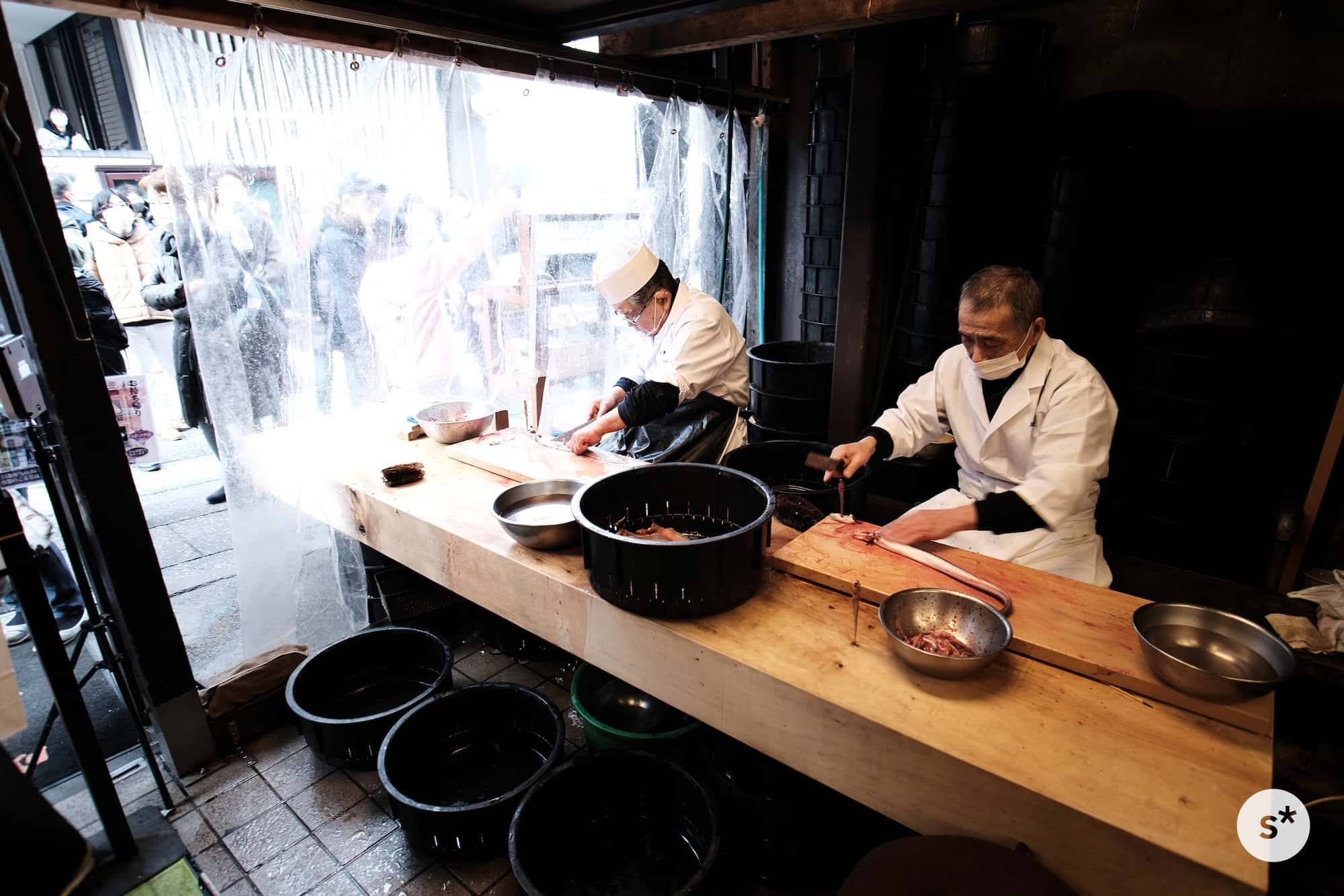 参拝したあとは、名店「川豊」さんでうな重を頂きました。入口のところで手際よく捌いているシーンが印象的だったので写真に収めました。このように空間を広く写すことができるのは、超広角レンズのおかげですね。