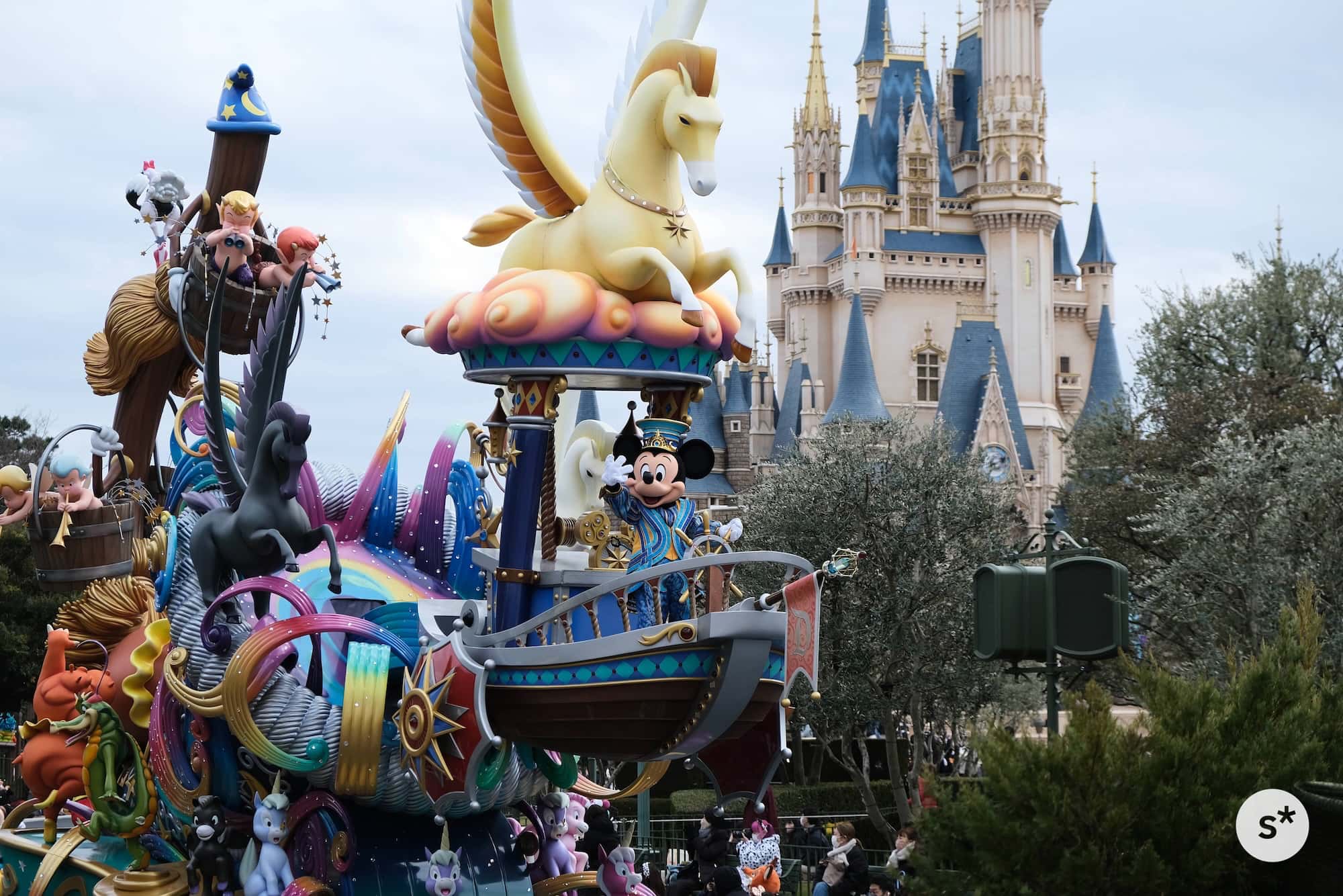 お昼のパレードでは、ちょうどミッキーがこっちを向いている写真が撮れました。シンデレラ城が背景になる場所を選んで陣取っていたので、すごくいい写真になりましたね。