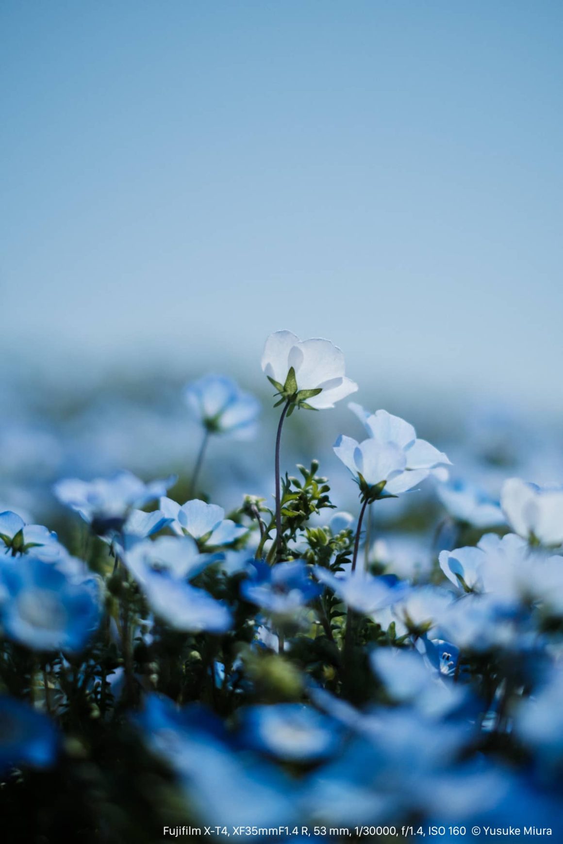 空は快晴の青、地面は咲き誇ったネモフィラの青。国営ひたち海浜公園のネモフィラの丘を切り取ったら、一面が青で埋め尽くされる素敵な写真になりました。満開の時期に快晴の日を狙って撮りに行く必要があるから、結構難易度高かったりします。