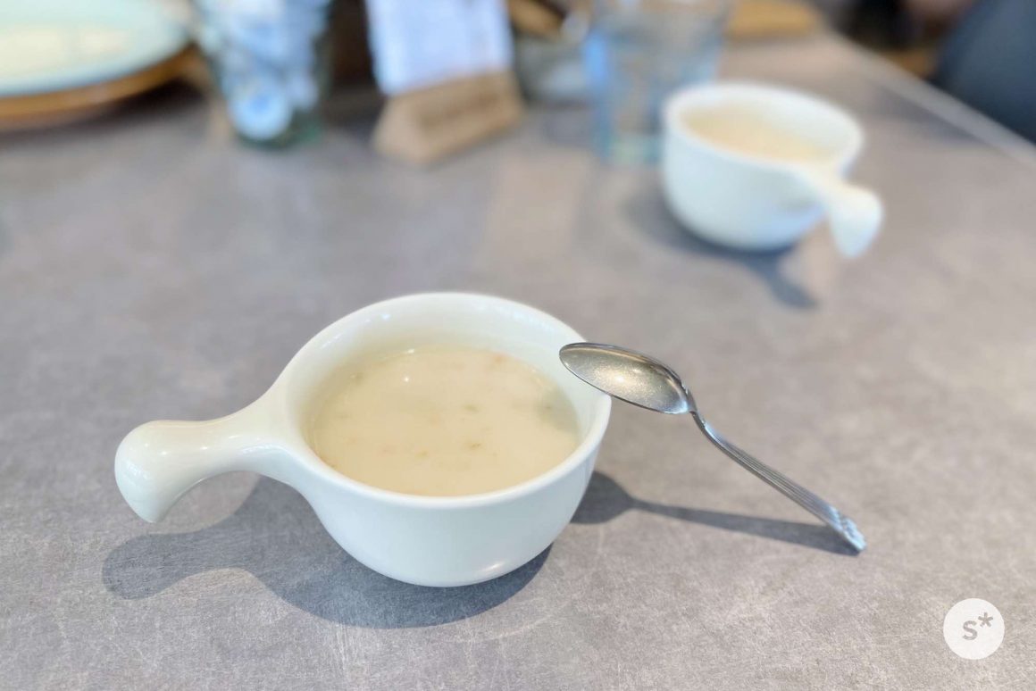 注文してから10分くらいでクラムチャウダーが運ばれてきました。具が小さめのタイプで、ジャガイモの原型がなくなるまで煮込まれていました。おいしい。