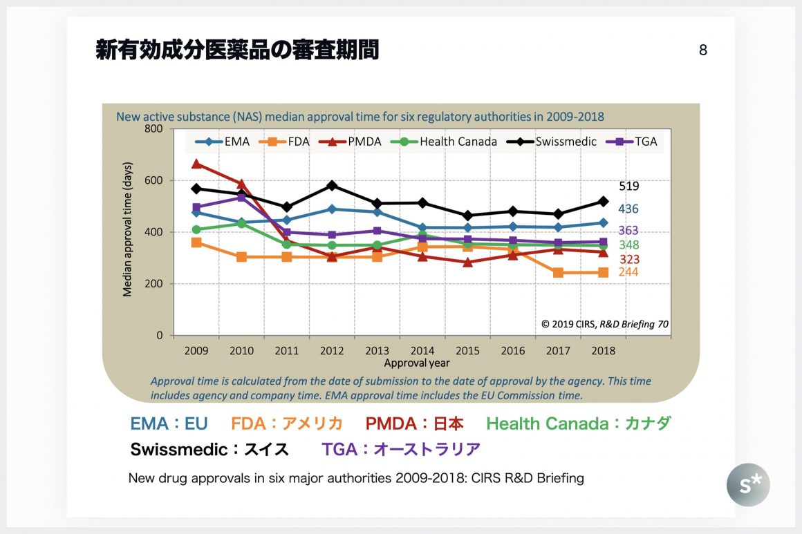 上の図で表しているのは、主要な規制当局における新有効成分医薬品の審査期間です。PMDAは赤で示しています。縦軸の値が小さいほど審査期間が短いということを表しており、2014〜2016年はPMDAが1位でしたが、その後FDA(アメリカ)が再度1位となっています。