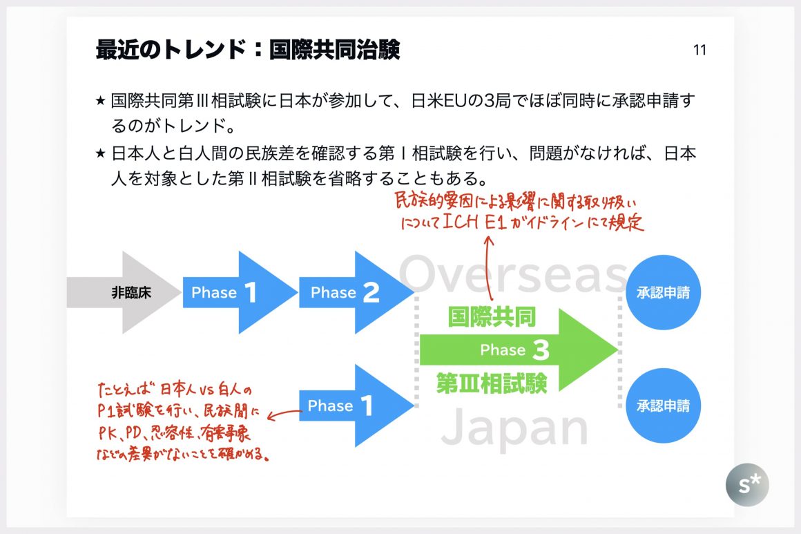 かなり極端な例を上のスライドに記しました。欧米から開発を始め、日本は後回しになっている状況と仮定した場合、国ごとに開発すればラグが生じます。それを防ぐために、例えば、欧米の第Ⅰ相試験の結果と日本の第Ⅰ相試験の結果を比較して問題がなければ、日本人対象の第Ⅱ相試験を省略の上で国際共同第Ⅲ相試験に組み入れることがあります。