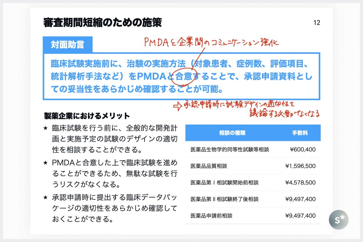 開発ラグ、審査ラグのいずれも解消している状況であることを紹介してきました。製薬企業としてもPMDAとしても、無駄な試験を実施せず効率的に開発が進むことを望んでいます。そのために、PMDAでは「対面助言」とよばれる治験相談を実施しています(FDAやEMAも同じような相談を実施しています)。