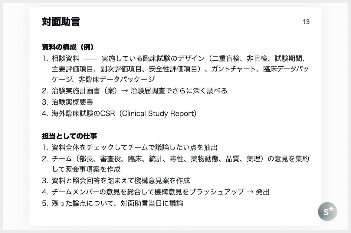 まず、対面助言実施日から起算して5週前の月曜日に製薬企業から相談資料一式を受け取ります。これには、相談内容が具体的に記載されている「相談資料」、実施予定の臨床試験の詳細を説明した「治験実施計画書」、これまでの非臨床・臨床試験の結果をまとめた「治験薬概要書」など、何百〜何千ページにも及ぶ膨大な資料が添付されてきます。